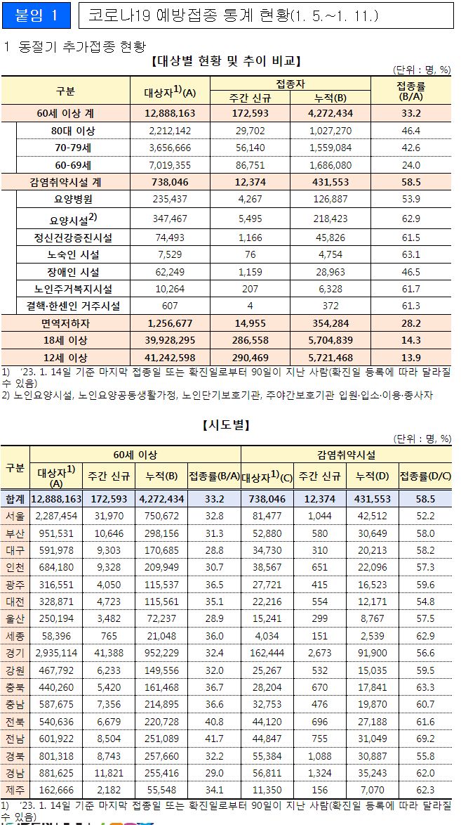 □ 감염취약시설 58.5%, 60세 이상 33.2% 동절기 추가접종(1.12. 기준)