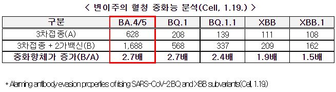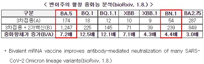 아쉬운 점. 보도자료에서 2가백신접종의 효과를 언급한 부분에서, "어느 2가백신"을 사용한 결과인지는 말하지 않았는데요, 예를 들어 지금 국내에서 접종 중인 2가지 2가백신(BA.1 대응 2가백신, BA.4/5 대응 2가백신) 중 어느 것을 말하는 것인지가 보도자료에는 언급이 없네요.1