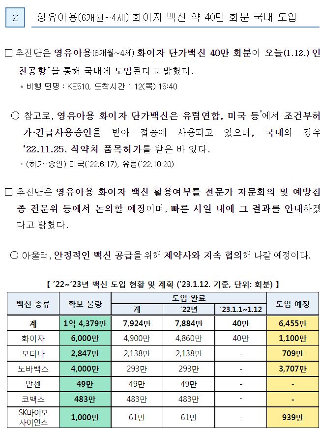 □ 화이자 영유아용(6개월~4세) 단가백신 40만 회분 도입(1.12.)