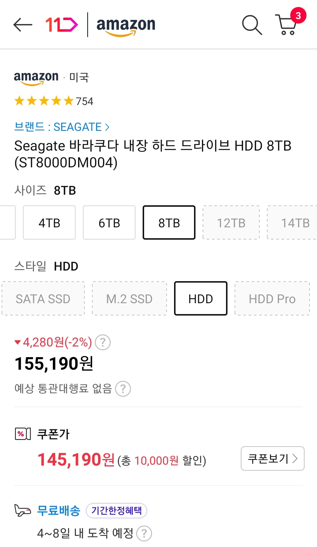 (11번가-아마존) 시게이트 바라쿠다 SMR(?) 하드디스크 8TB (14.5만/일반) 본문