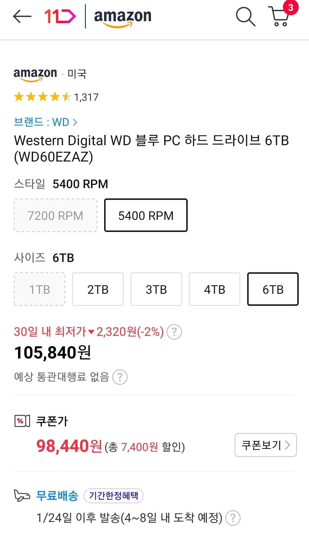 (11번가-아마존) WD 블루 6TB SMR(?) 5400rpm 256MB cache HDD (9.8만원/일반) 본문