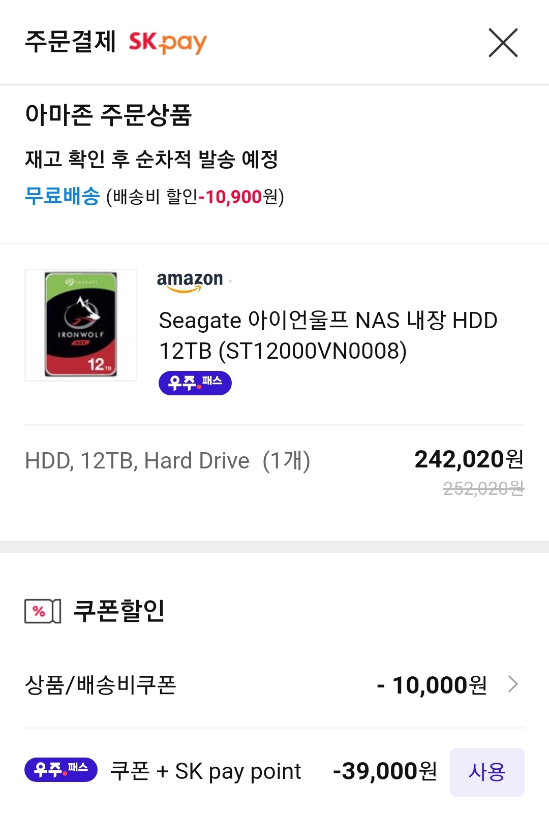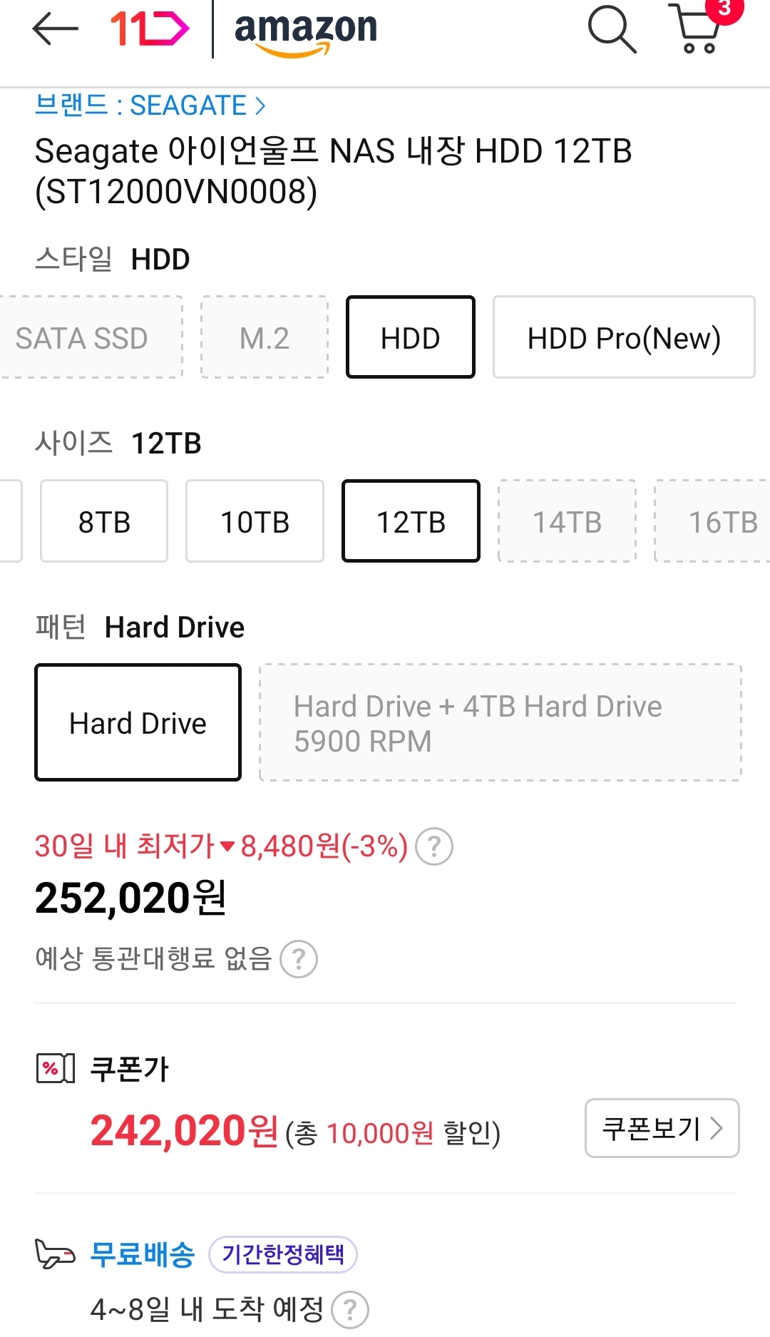 (11번가-아마존) 시게이트 아이언울프 NAS 12TB HDD (24.2만원/일반) 본문