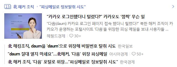 北 해커 조직, '다음' 포털로 위장…"피싱메일로 정보탈취 시도"