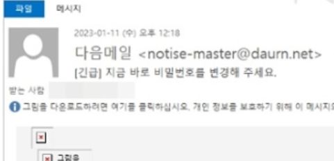 (......) 공격자는 발신자 도메인을 daurn.net ( d a u r n . n e t )도메인을 사용해 daum ( d a u m )도메인처럼 보이려고 시도(......) 해당 이메일에는 ‘그림 자동 다운로드 옵션’이 활성화돼 있는 경우 사용자 정보를 제작자에게 전달하는 코드가 포함됐다. 다만 해당 옵션이 ‘width:0px;height:0px’로 설정돼 있어 실제 이미지는 사용자에게 보이지 않는다. (......)