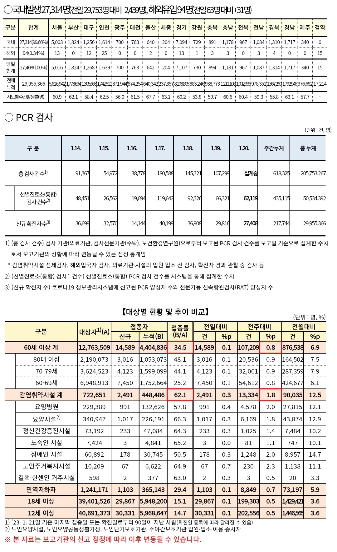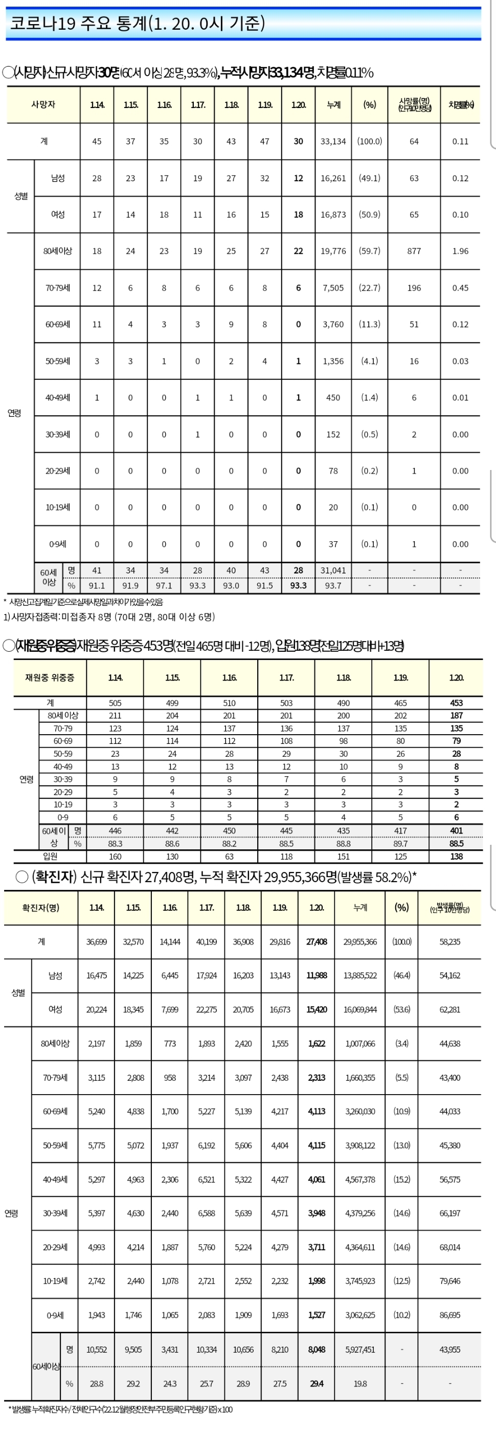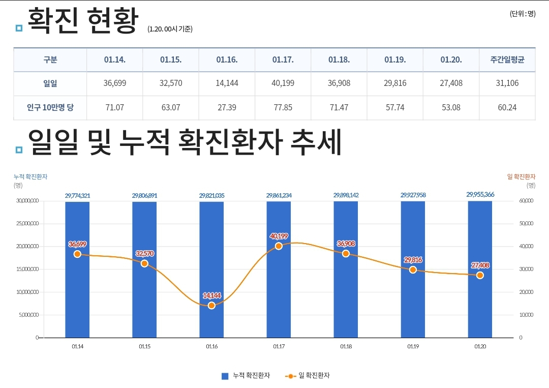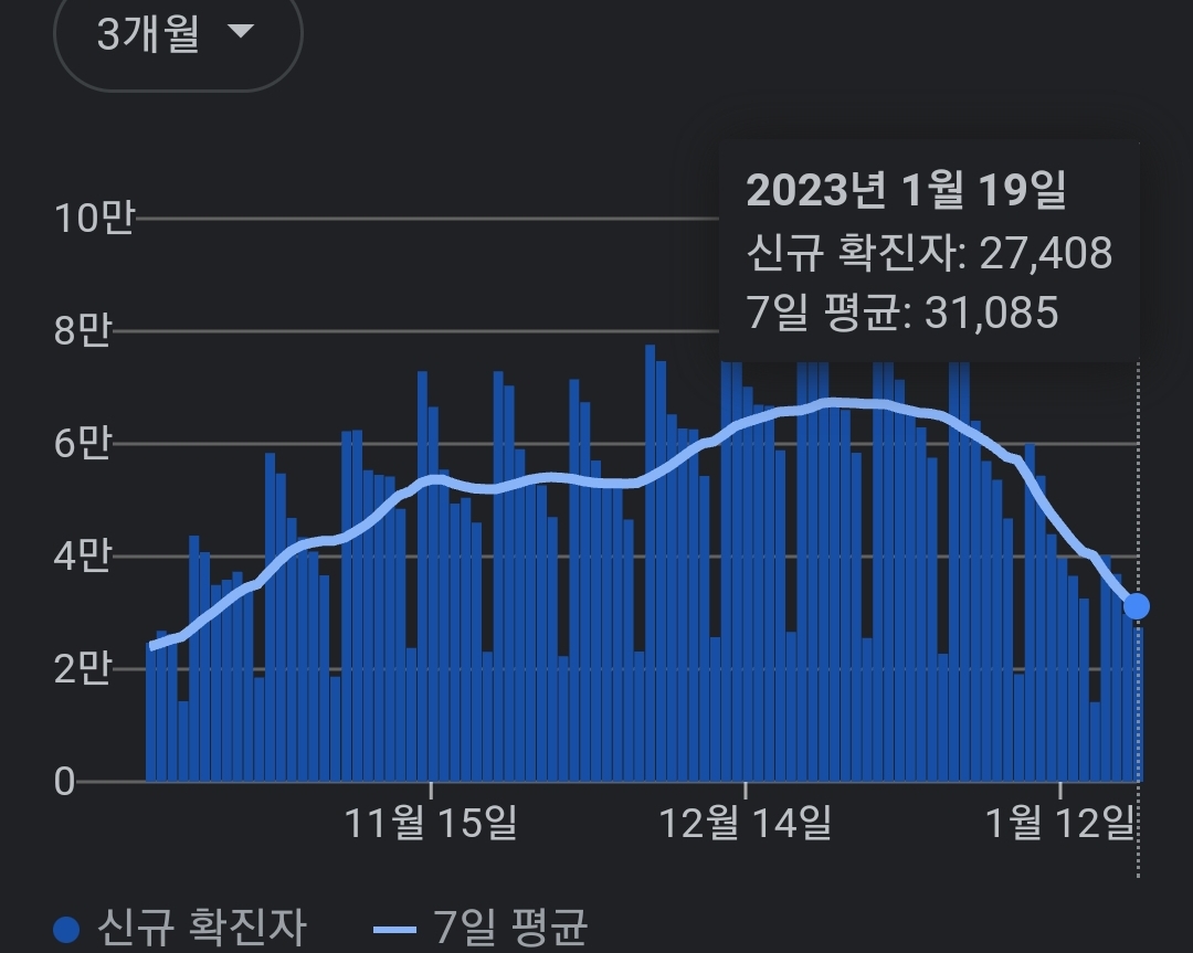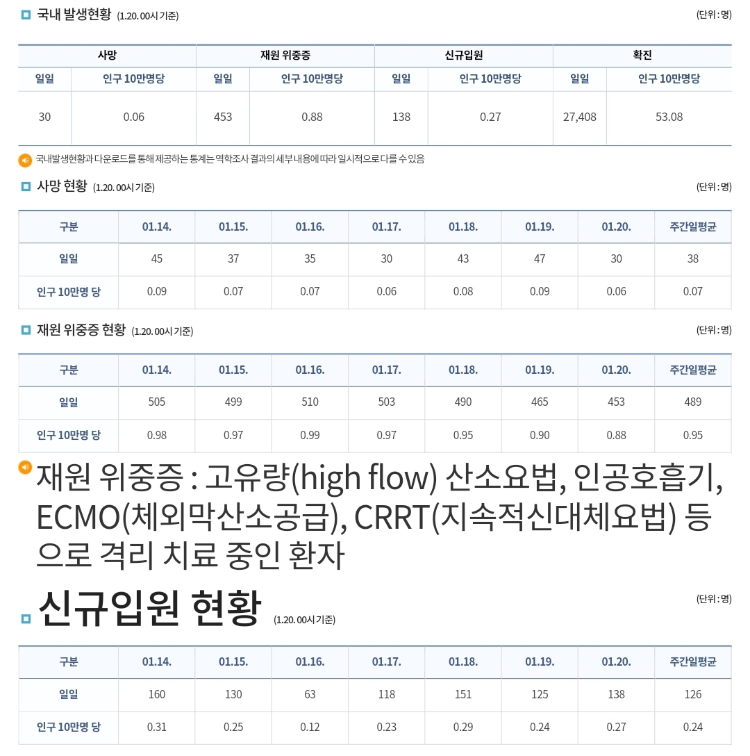 코로나19집계(2023.1.20) 확진 +2.7만 ★ , 사망 +30명, 중환자병상가동률 29% 본문