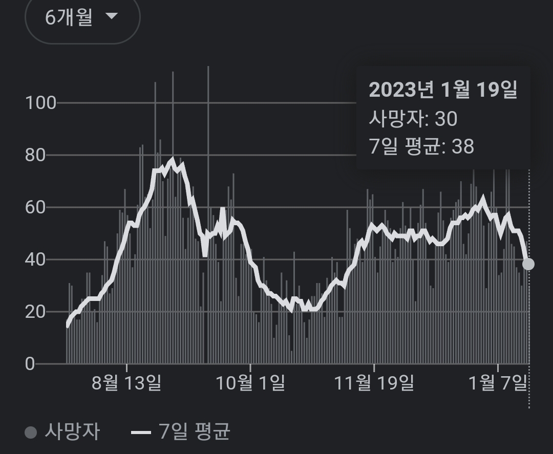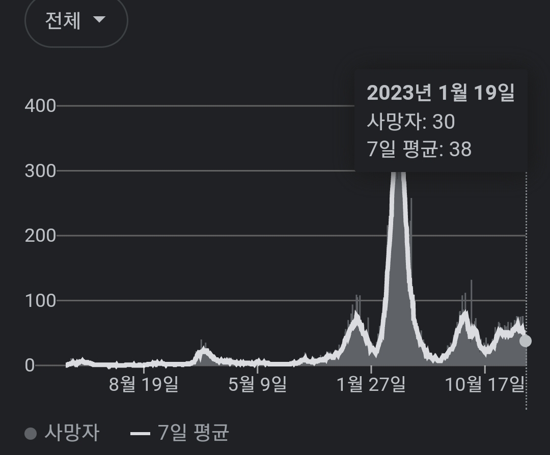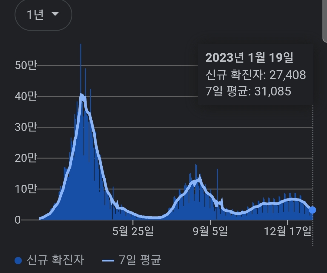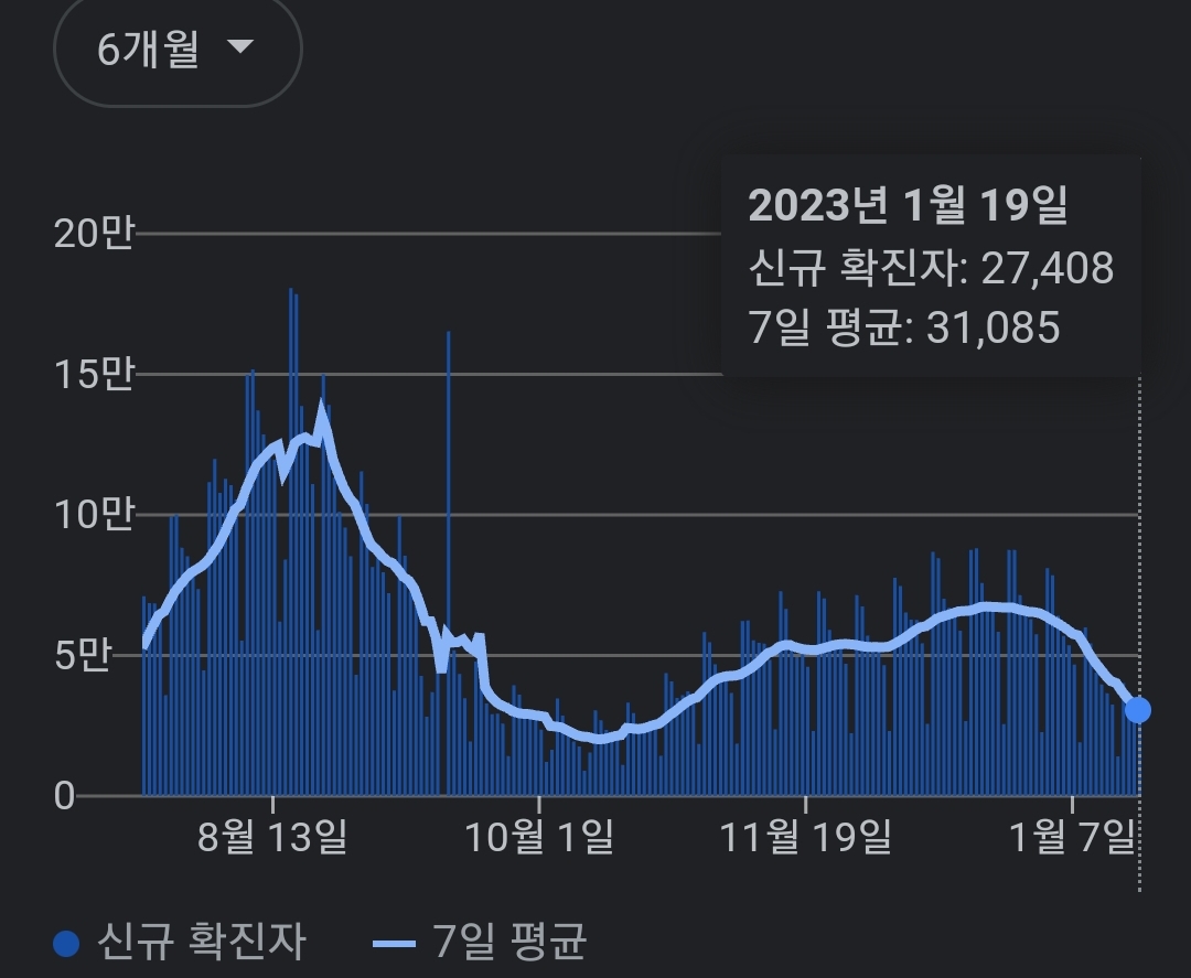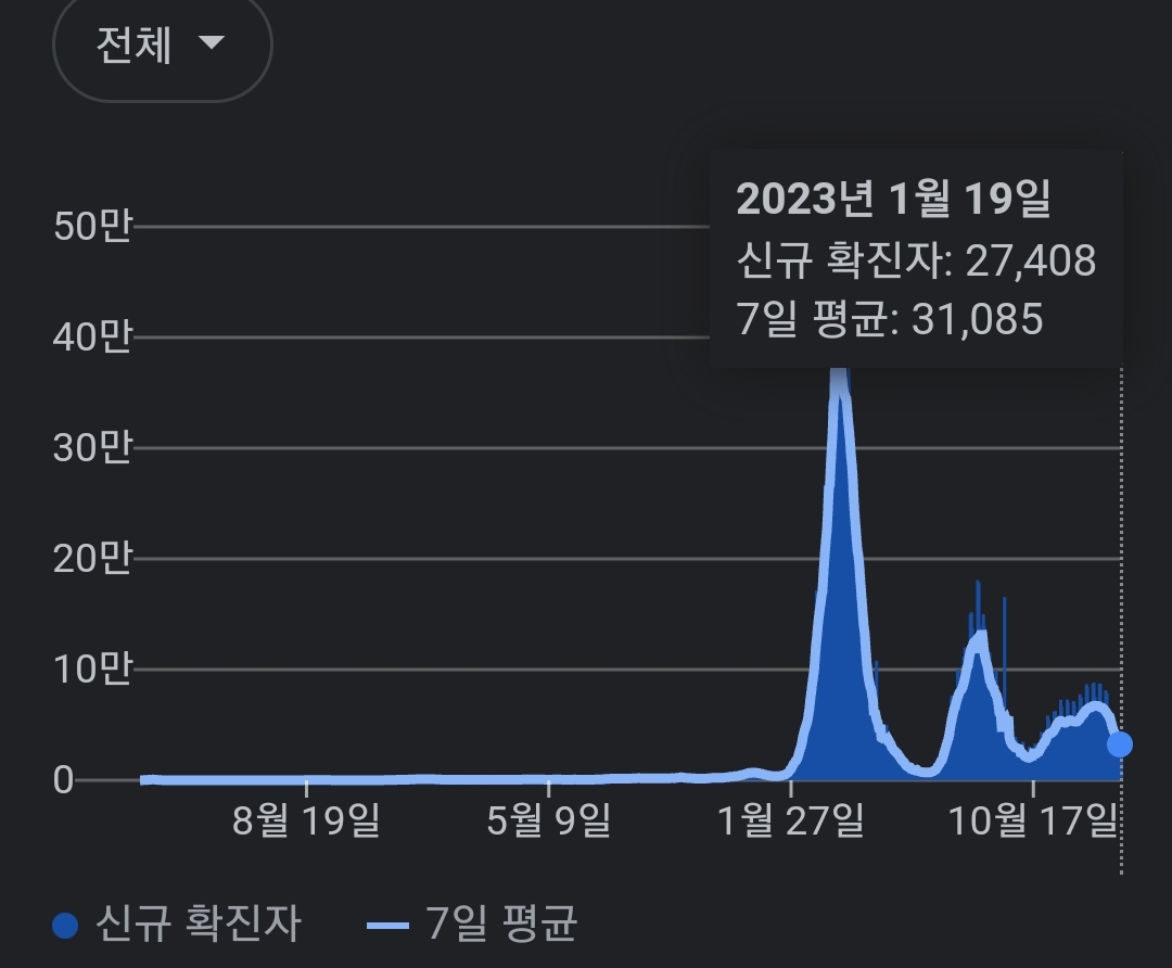 | 코로나19집계(2023.1.19. 0시기준): 확진 +3만, 사망 +47명, 중환자병상가동률 29% (0) | 2023.01.19 |