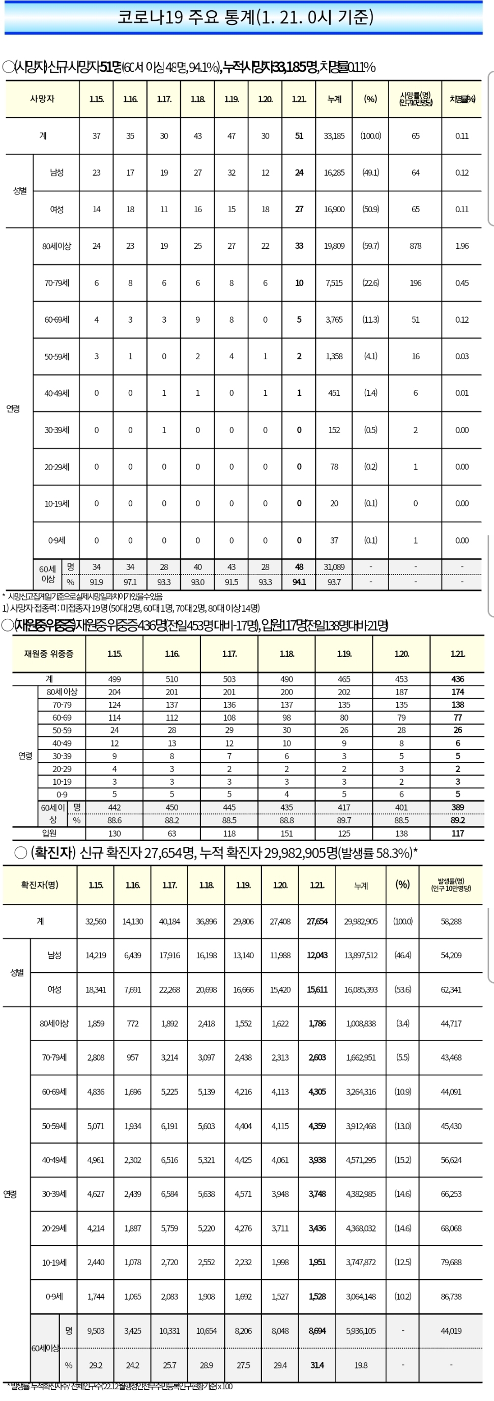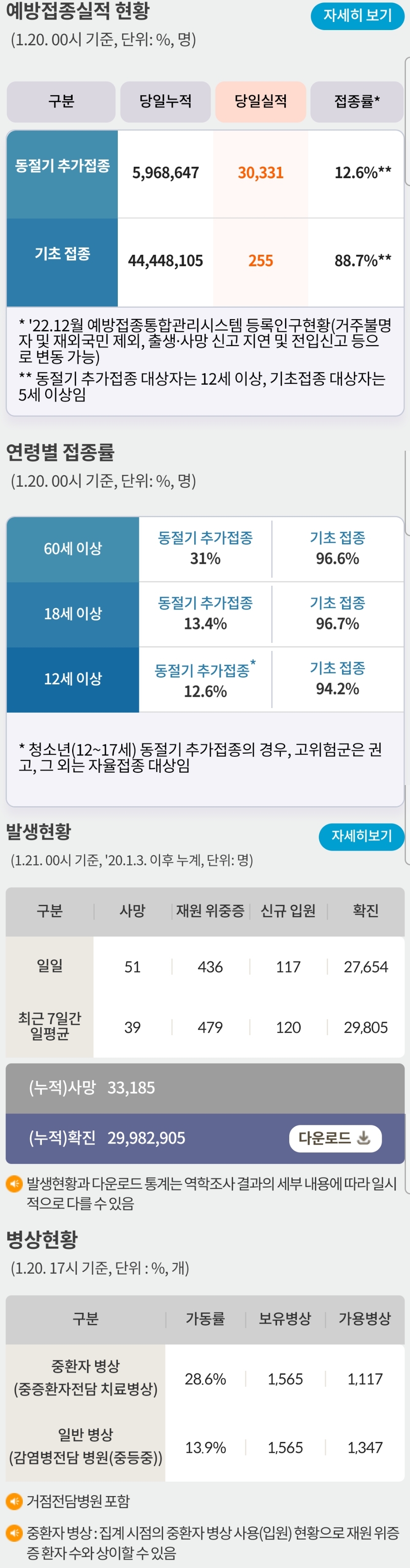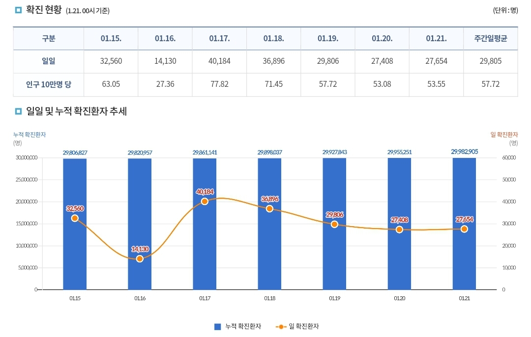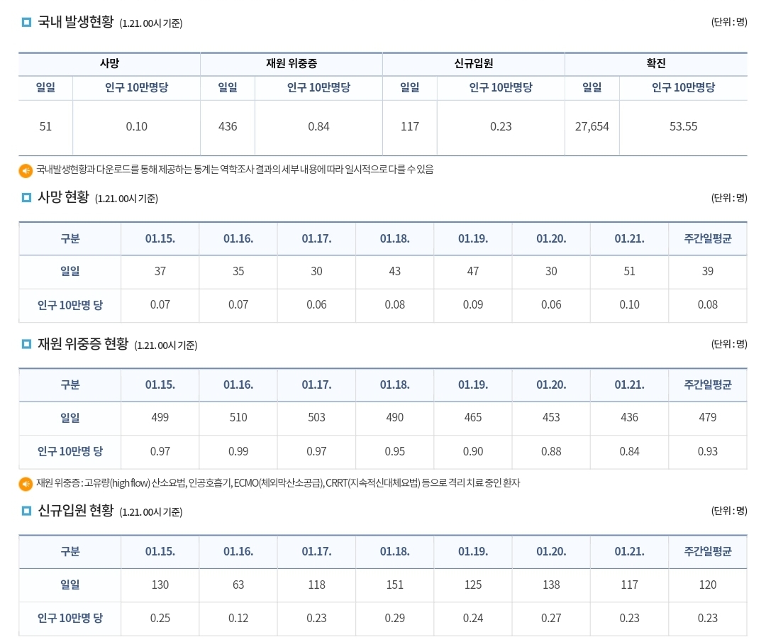 코로나19집계(2023.1.21. 0시기준) 확진 +2.8만, 사망 +51, 중환자병상가동률 29% 본문