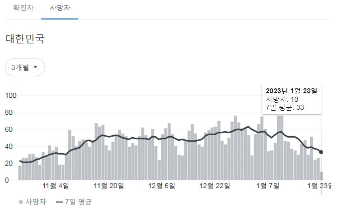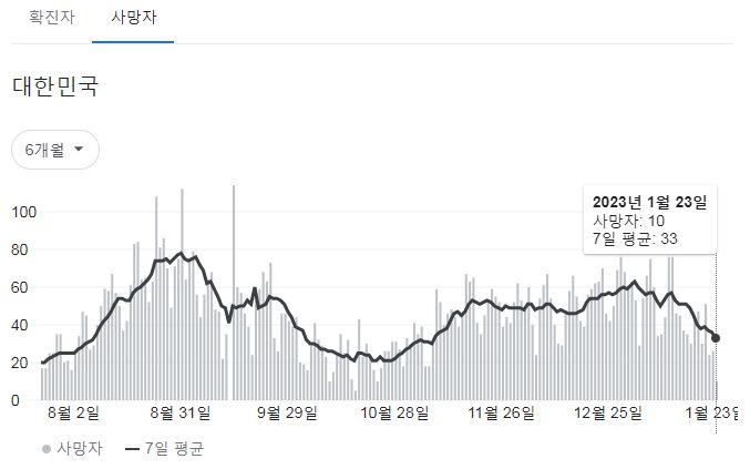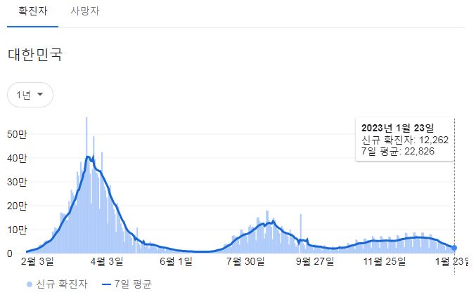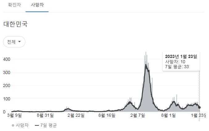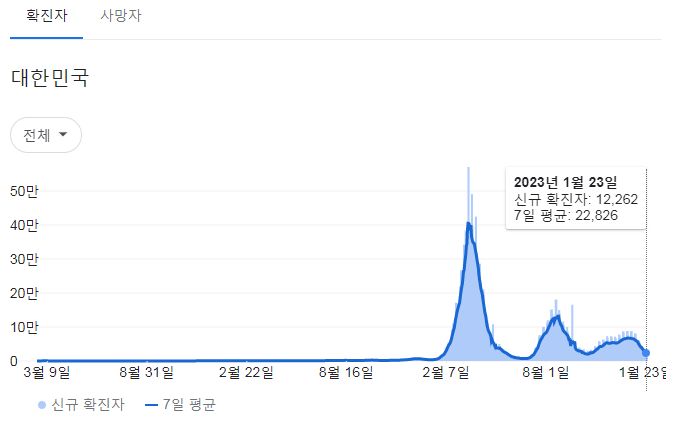 | 코로나19집계(2023.1.23. 0시기준): 확진 +9천, 사망 +26명, 중환자병상가동률 30% (0) | 2023.01.23 |