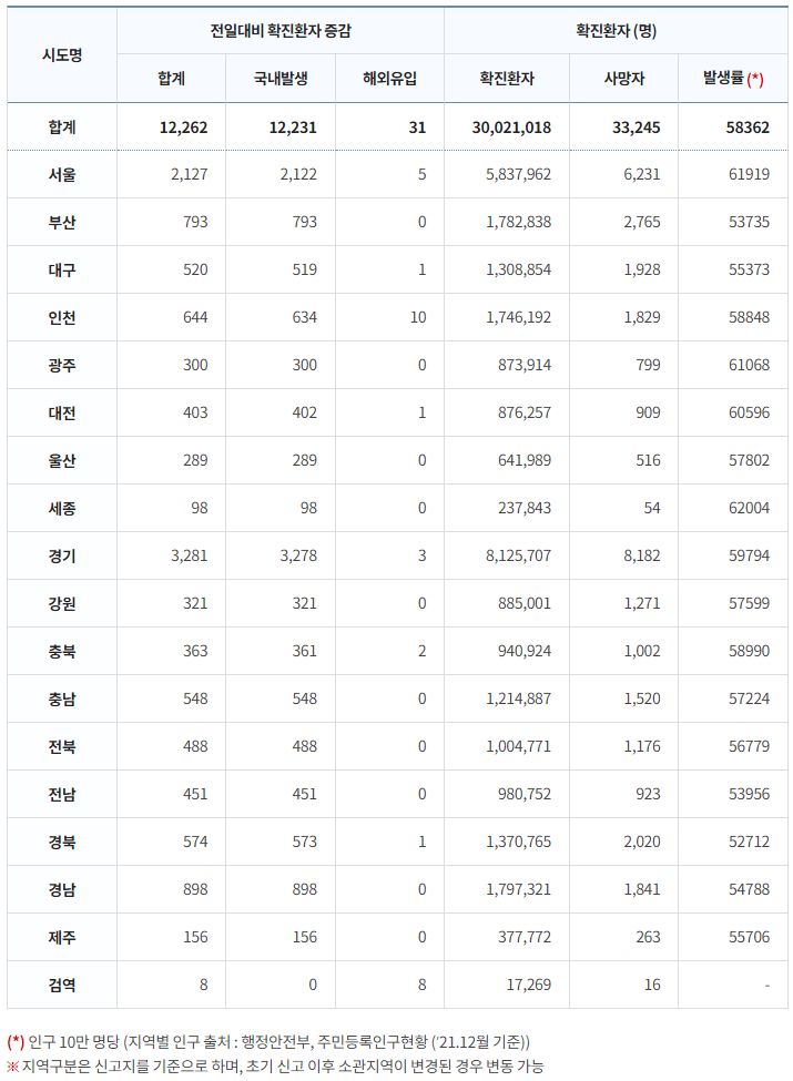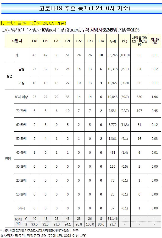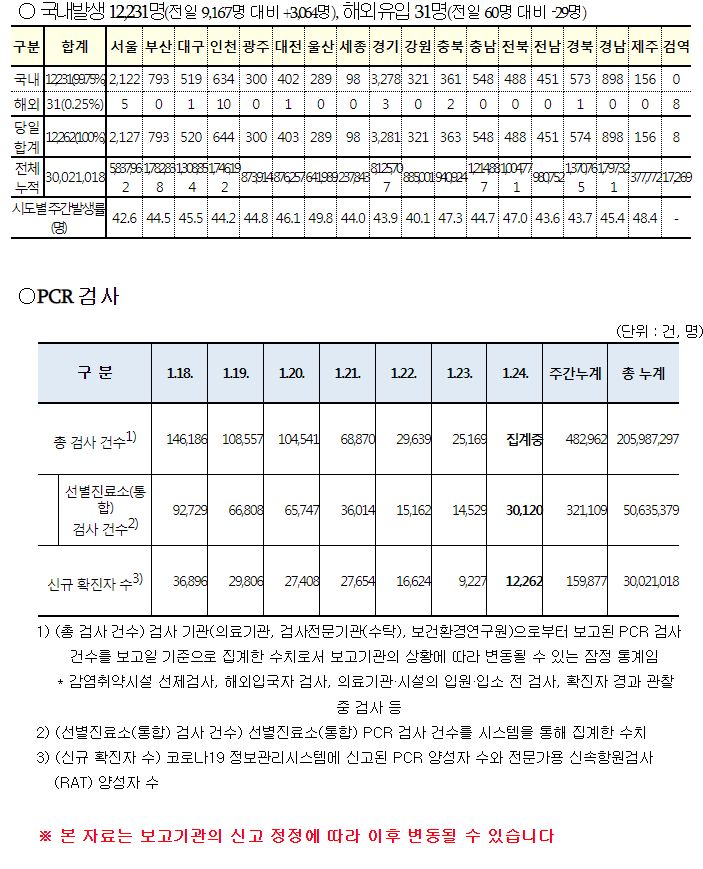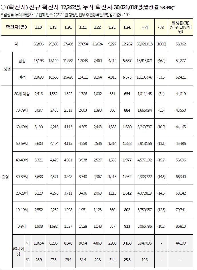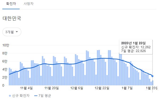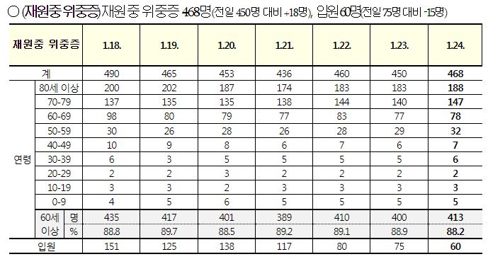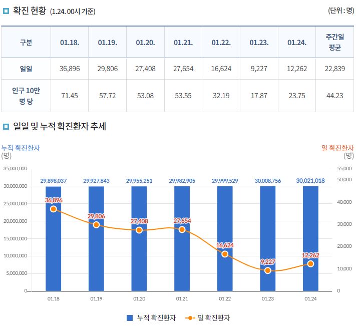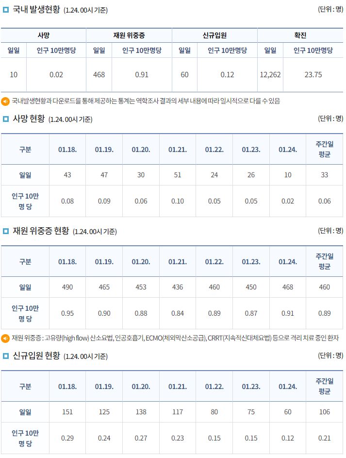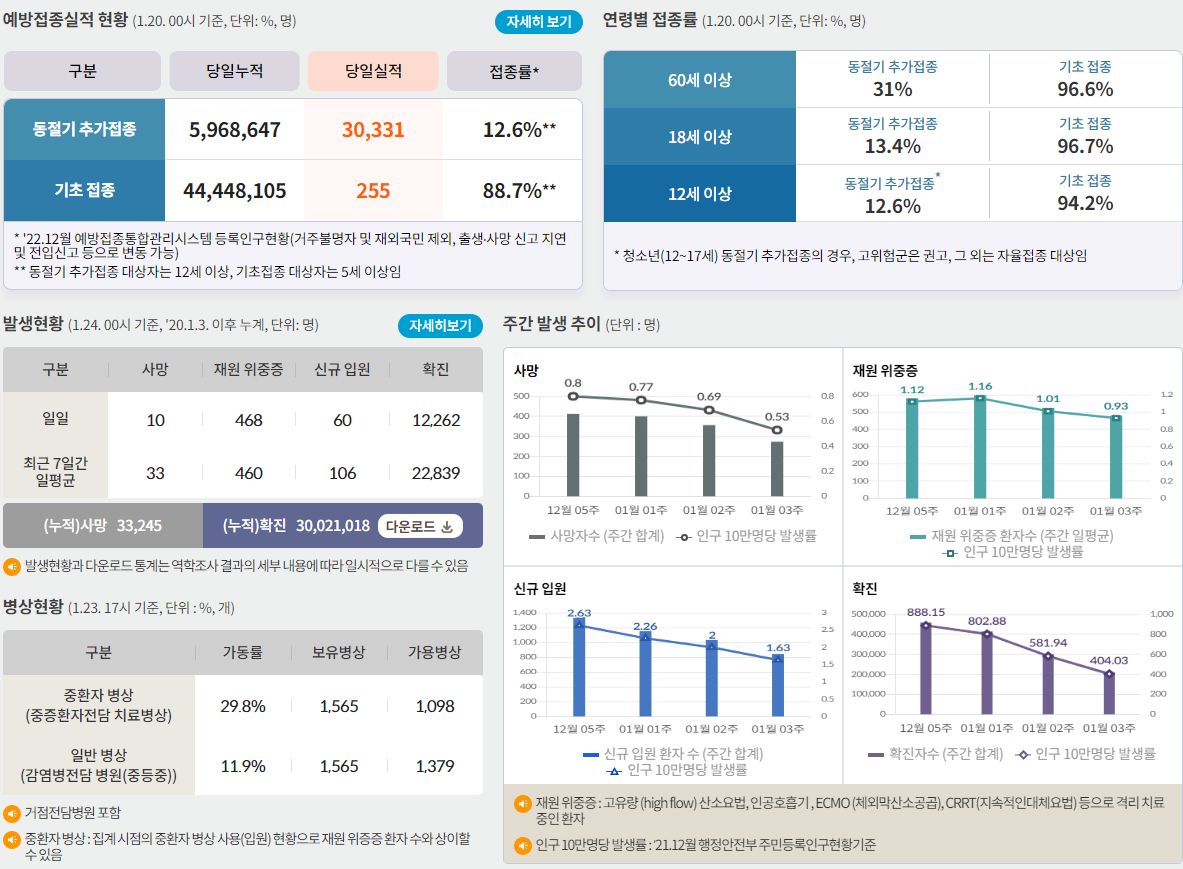 코로나19집계(2023.1.24. 0시기준): 확진 +1.2만, 사망 +10명, 중환자병상가동률 30% 본문