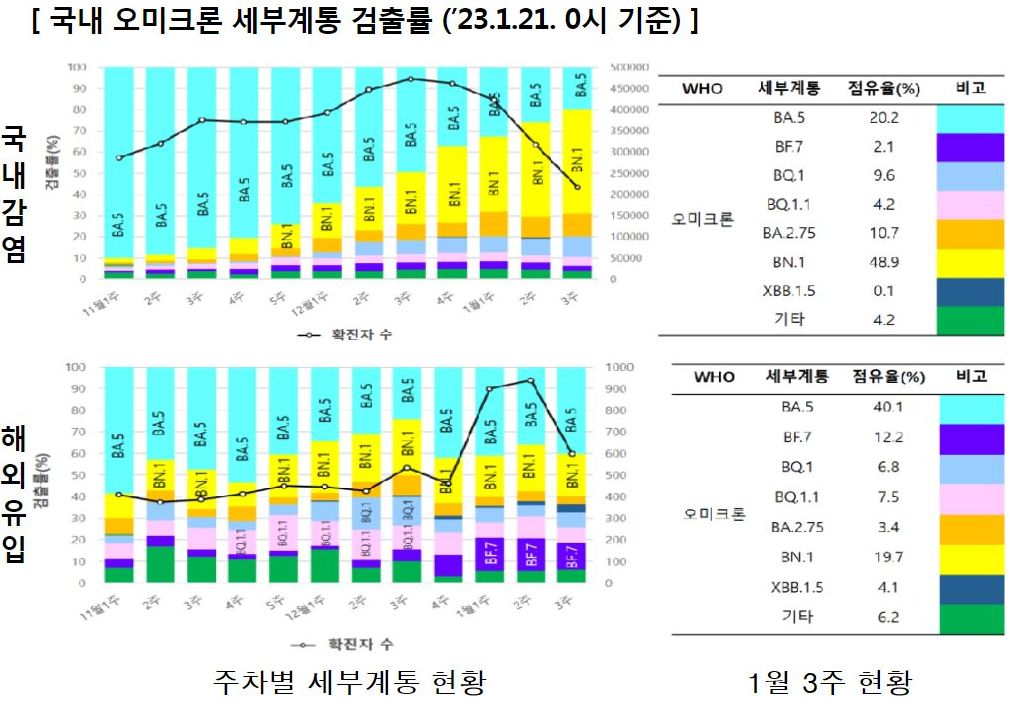 - 미국 내 발생이 증가하는 XBB.1.5는 8건 추가 검출(국내 2건, 해외유입 6건)되어, 누적 총 39건(국내 14건, 해외유입 25건)이 확인되었다.