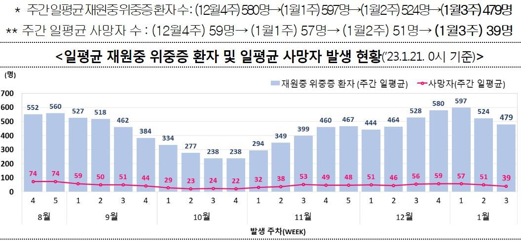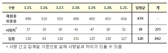 ※ 일평균 재원중 위중증 환자 중 50세 이상 452명(94.4%), 일평균 사망자 중 50세 이상 38명(97.4%)