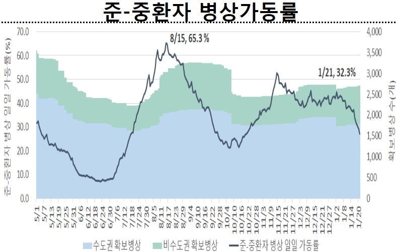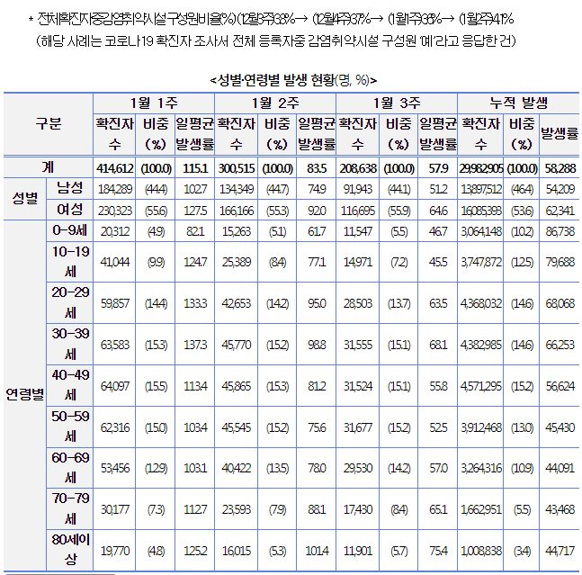 ○ 1월 3주 일평균 재원중 위중증 환자 중 60세 이상은 425명(88.7%), 일평균 사망자 중 60세 이상은 36명(92.3%)이었다.