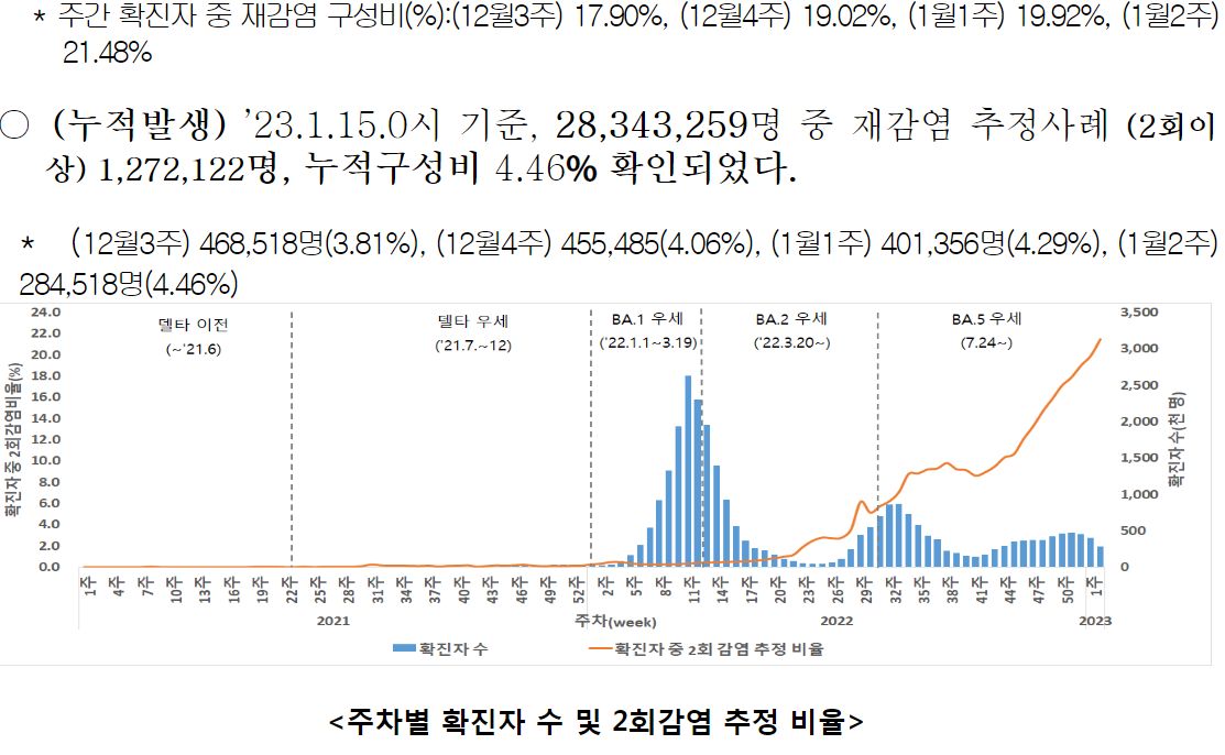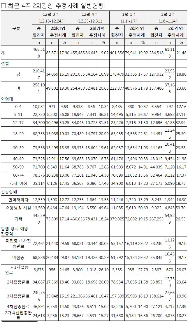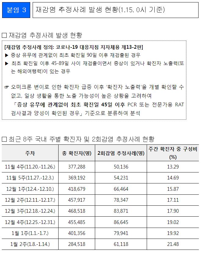 ○ 주간(1.8.~1.14.) 확진자 중 재감염 추정사례 비율 21.48%로 전주(19.92%) 대비 증가