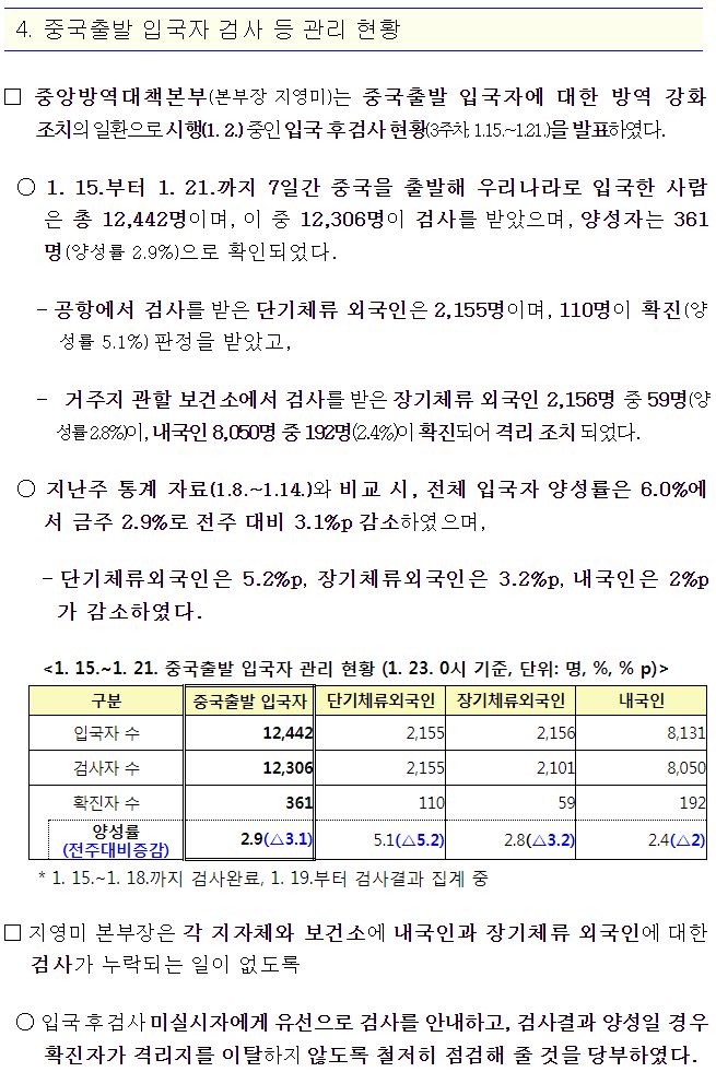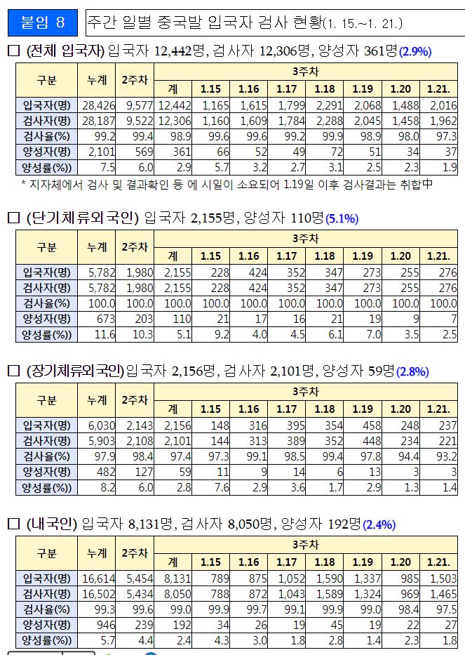□ 중국출발 입국자 검사 등 관리 현황(1.15~21.)