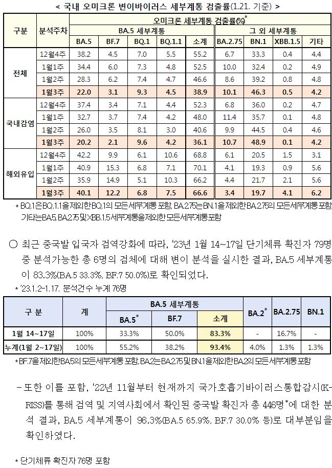 - 중국발 입국자 검역결과도 아직은 BA.5 세부계통이 대부분.