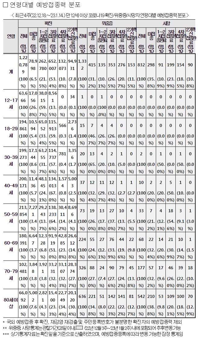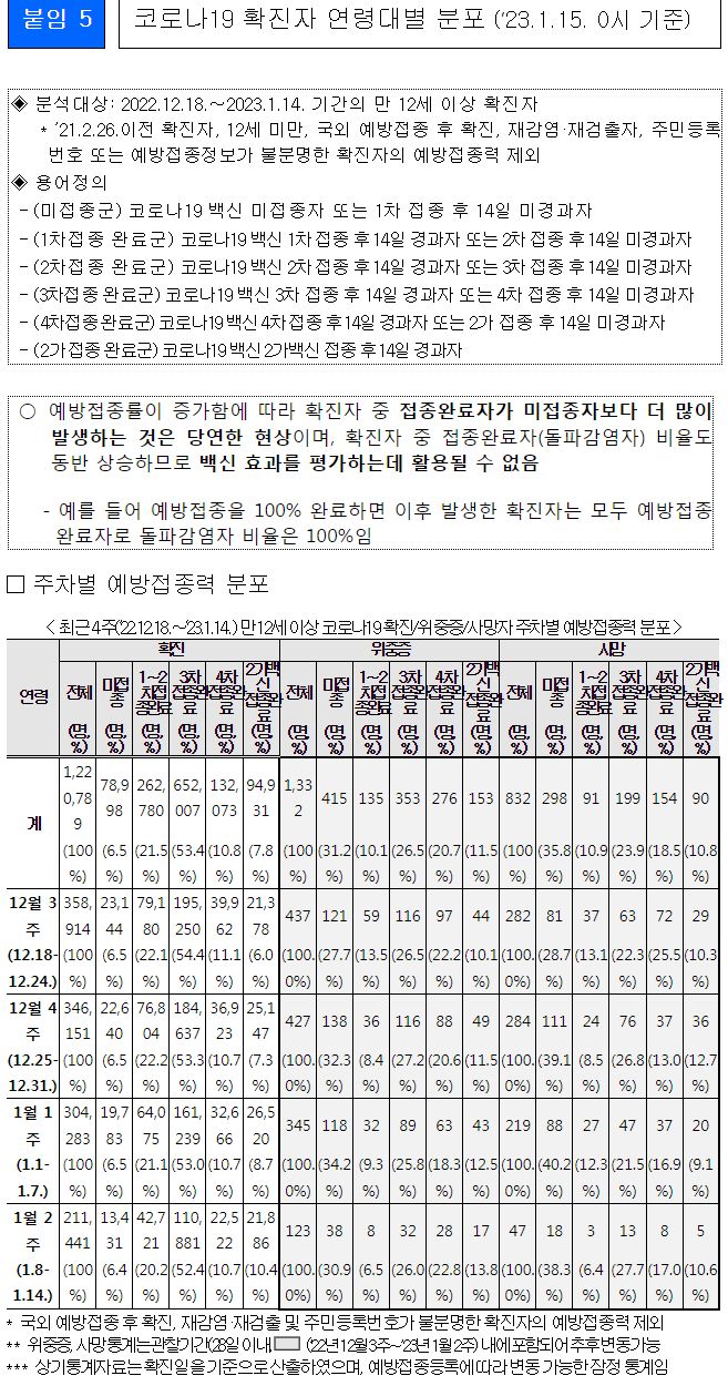 * 코로나19 확진자 연령대별 분포, 연령대별 예방접종력 (’23.1.15. 0시 기준)