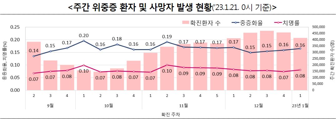 ○ 1월 1주차 확진자를 2주간 모니터링한 결과, 중증화율 0.16%, 치명률은 0.08%이었다.