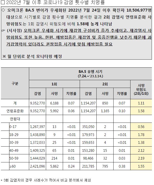 2022년 7월 이후 코로나19 감염 횟수별 치명률: 중년층 이상에서 재감염시 사망위험도 높음.