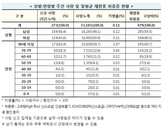 - 80세 이상의 누적 사망률이 939.7명(치명률 1.97%)으로 가장 높고, 70대는 202.3명(치명률 0.45%), 60대는 52.5명(치명률 0.12%)이었다.