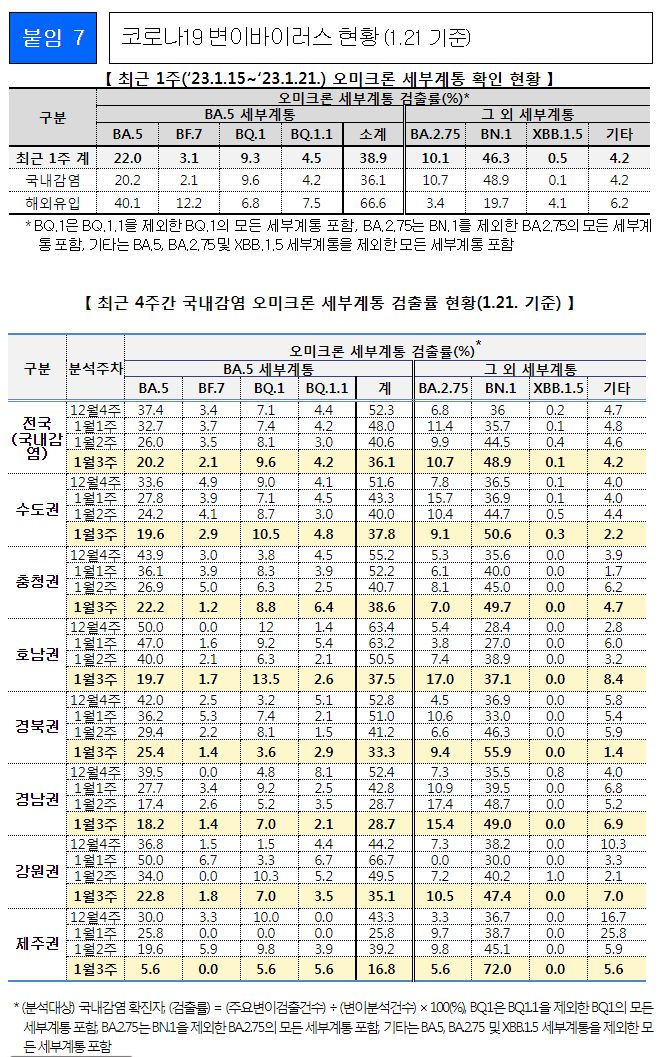 * BF.7, BQ.1, BQ.1.1을 제외한 BA.5의 모든 세부계통
