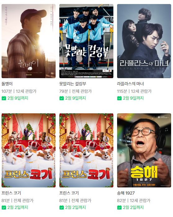 | (네이버시리즈온 무료영화) 효자동 이발사, 새벽의 황당한 저주, 프린스 코기, 송해 1927, 내 어깨 위 고양이 밥2 등 (0) | 2023.01.20 |