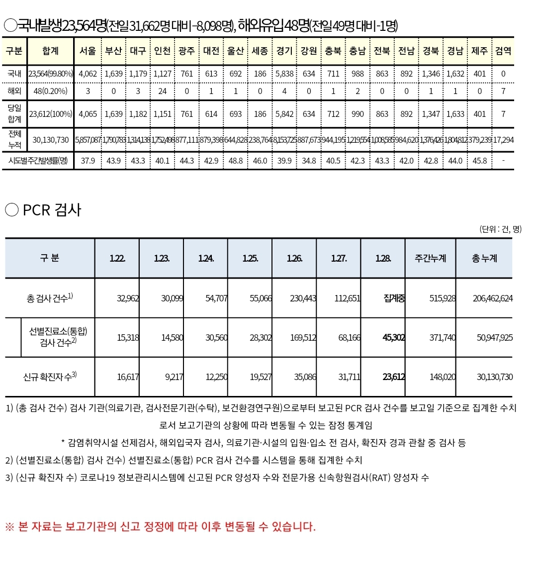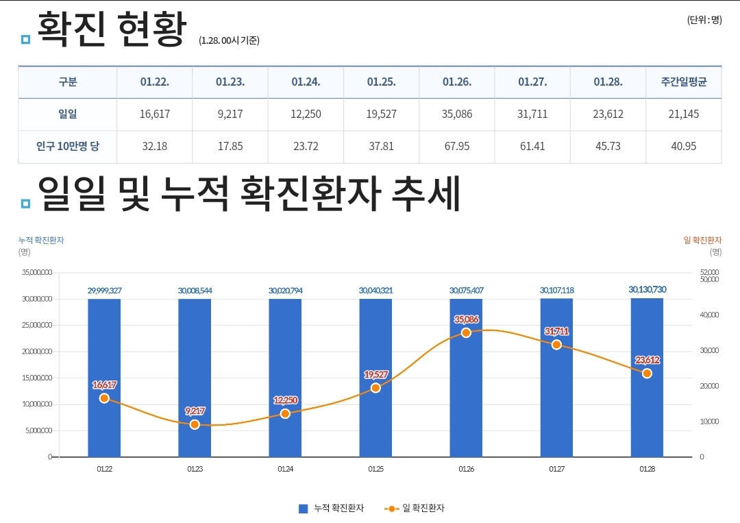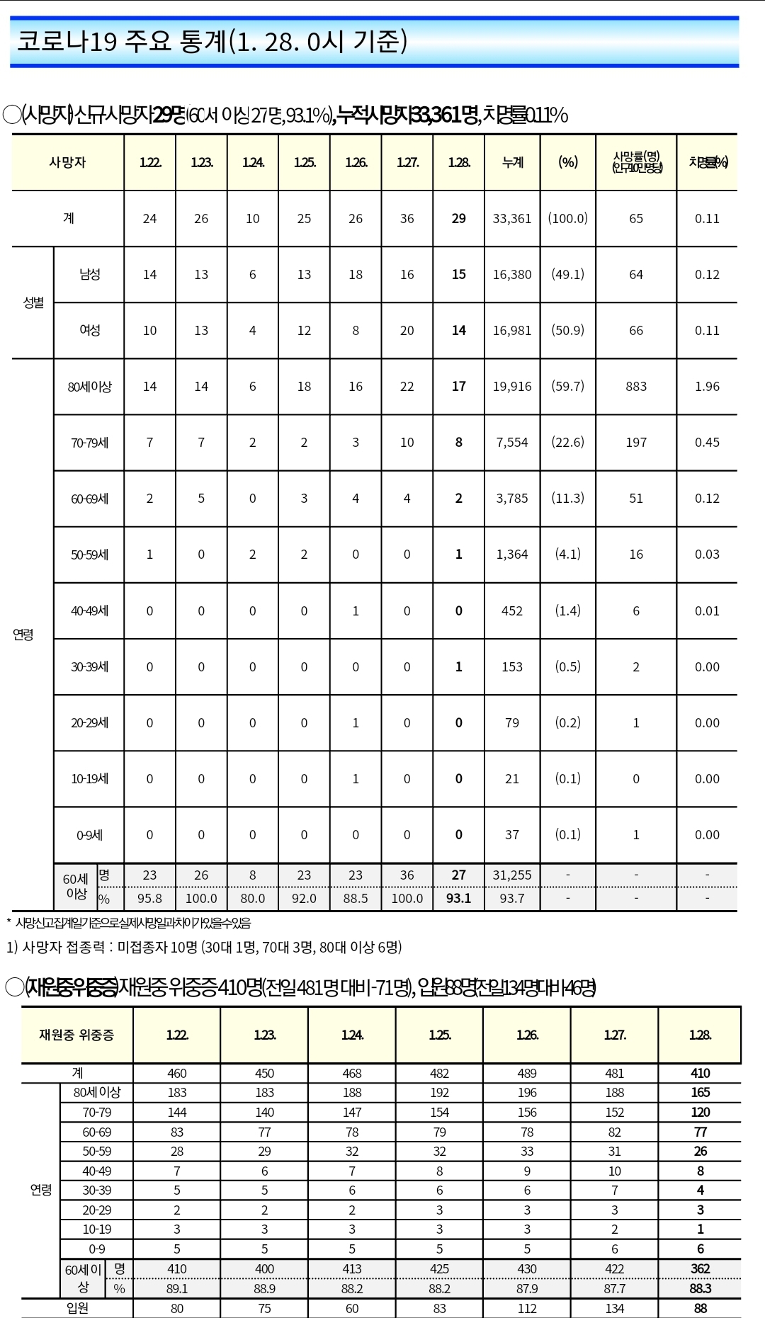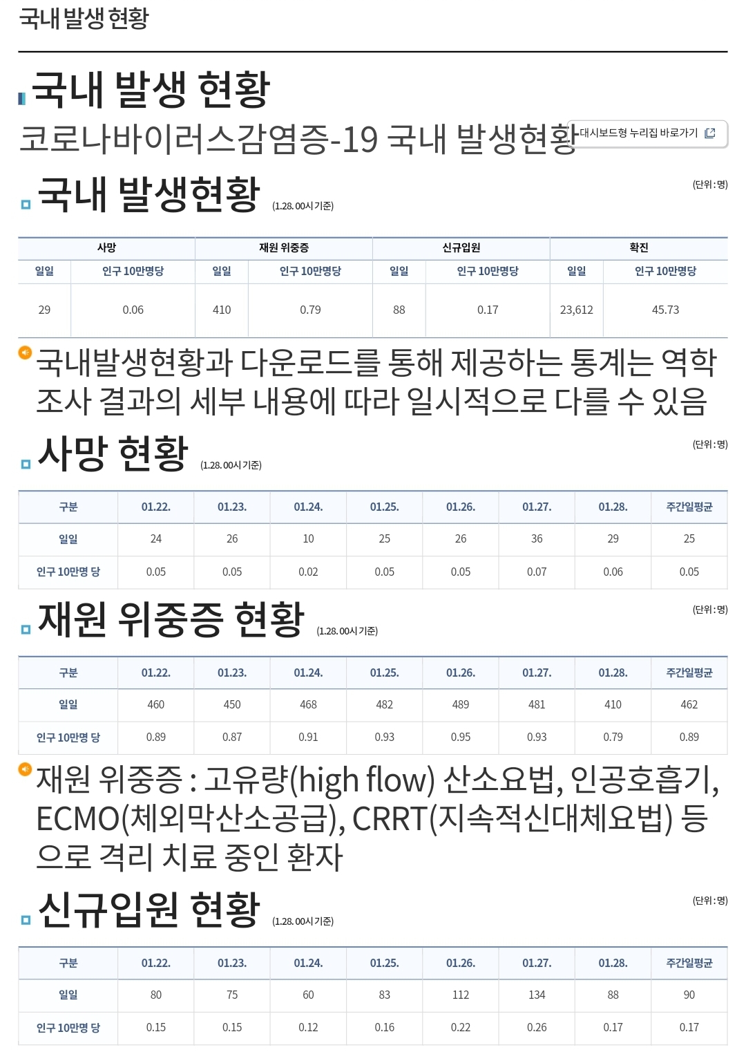 코로나19집계(2022.1.28. 0시기준) 확진 +2.4만, 사망 +29명, 중환자병상가동률 24% 본문