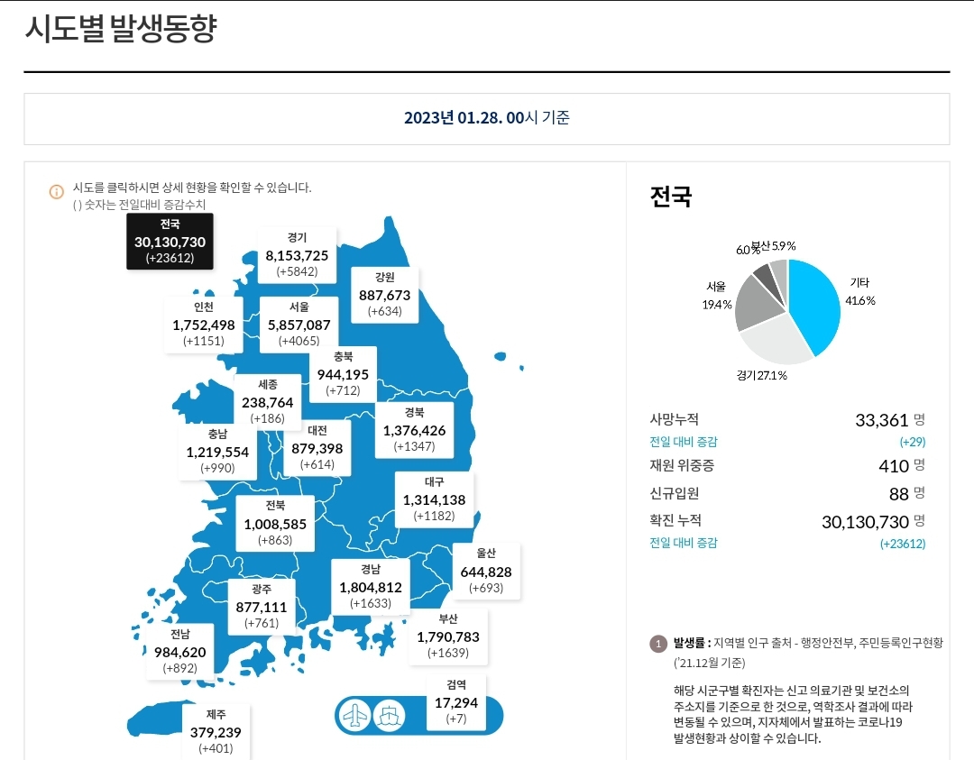 | 코로나19집계(2023.1.29. 0시기준) 확진 +1.9만, 사망 +29명, 중환자병상가동률 24% (0) | 2023.01.29 |