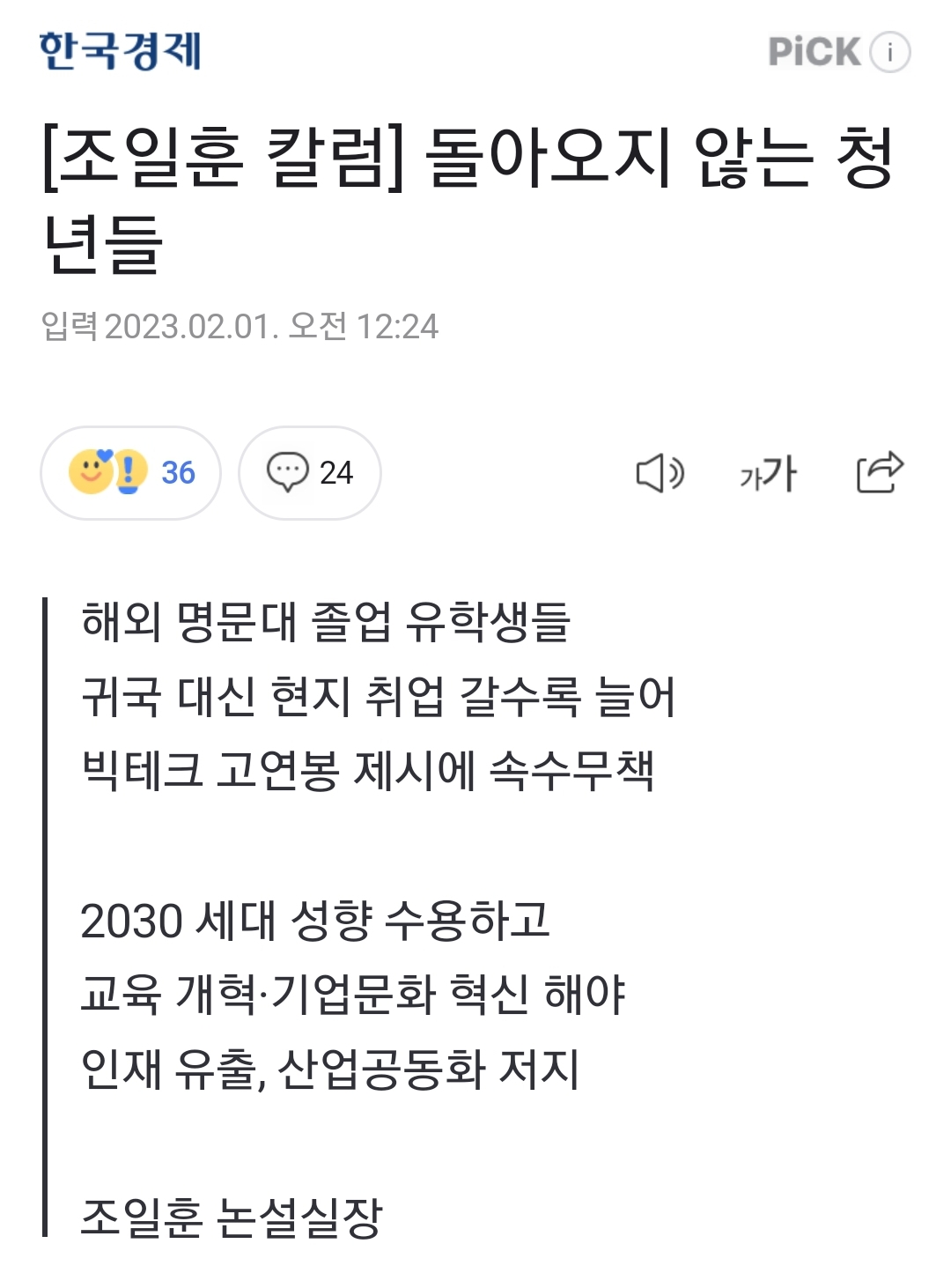 '청년 인구를 더욱 귀하게 아끼고 키우는 방향으로 국가 교육과 기업 문화, 보수 체계를 전면 혁신해야' 본문