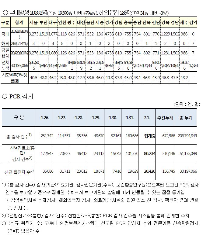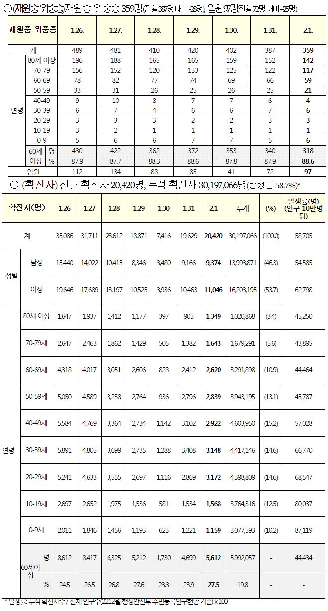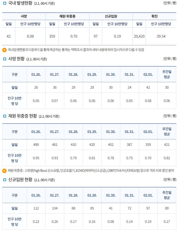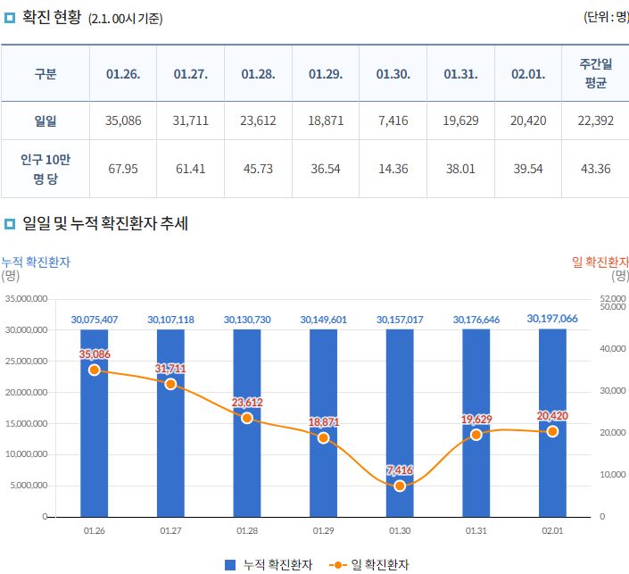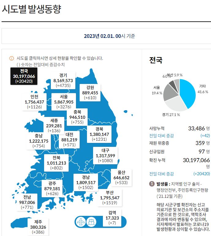 코로나19집계(2023.2.1. 0시기준): 확진 +2만, 사망 +42명, 중환자병상가동률 23% 본문
