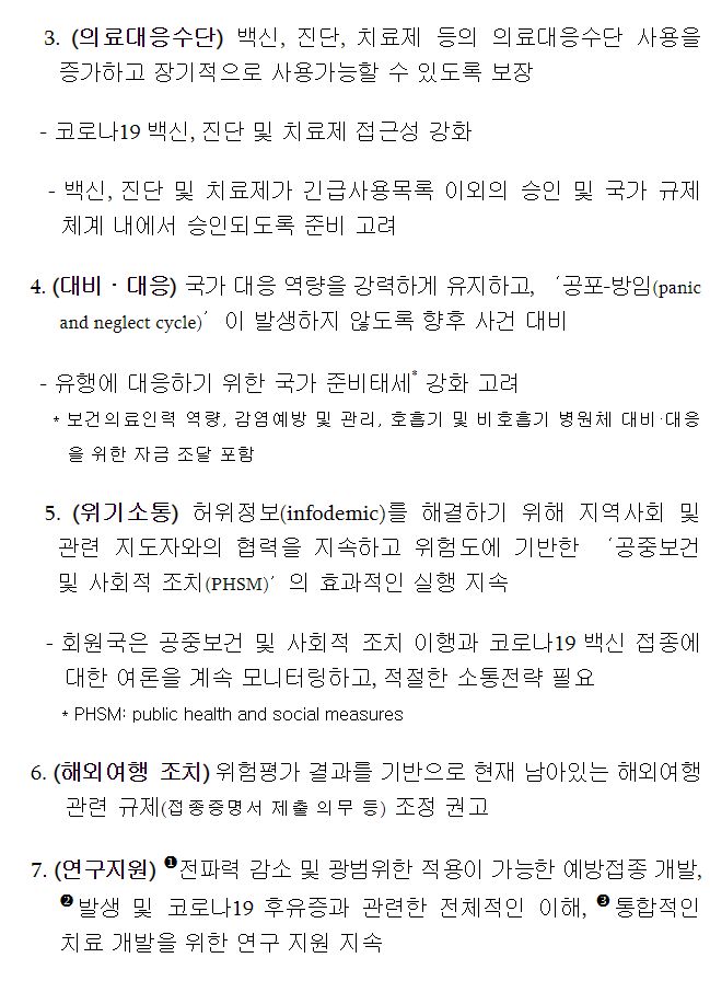 - WHO의 PHEIC 종료 시 코로나19 백신, 진단, 치료제의 개발 및 승인에 대한 규제 관련 평가가 필요하며