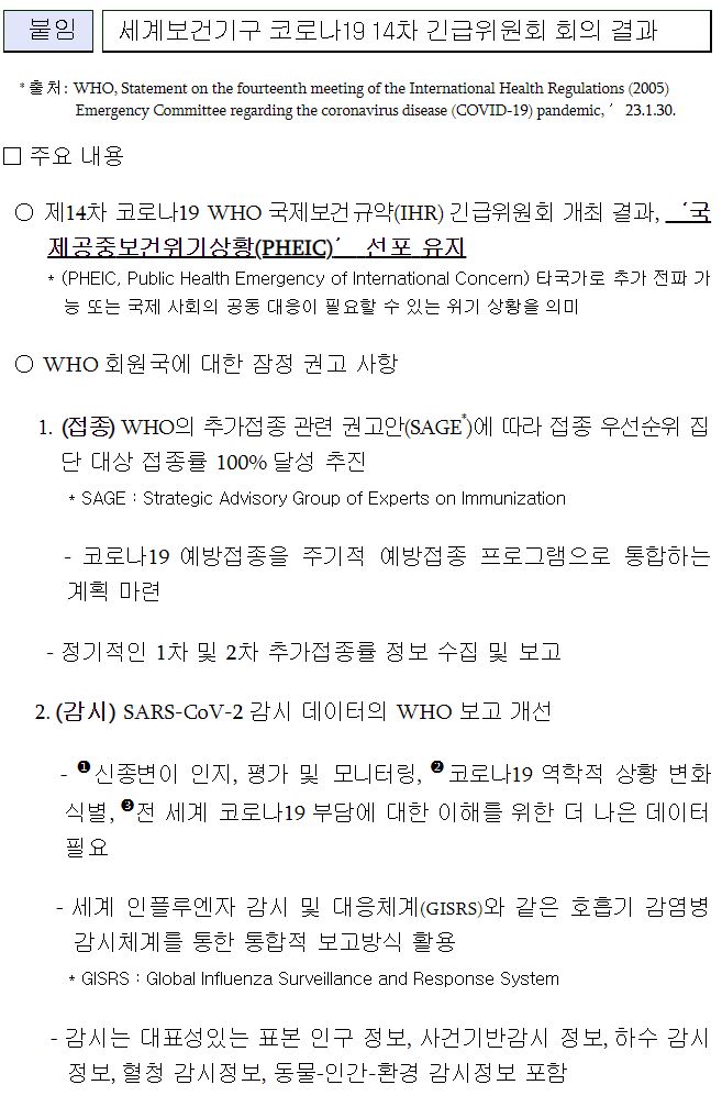 □ 세계보건기구(WHO)는 긴급위원회의 권고를 받아들여(‘23.1.27.) 코로나19 국제공중보건위기상황(PHEIC*) 선포를 유지한다는 결과를 발표(’23.1.30.)하였다.