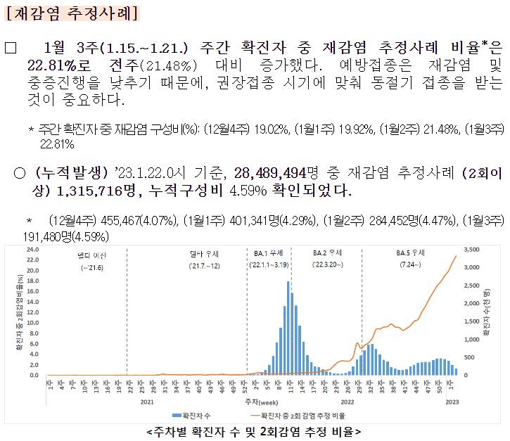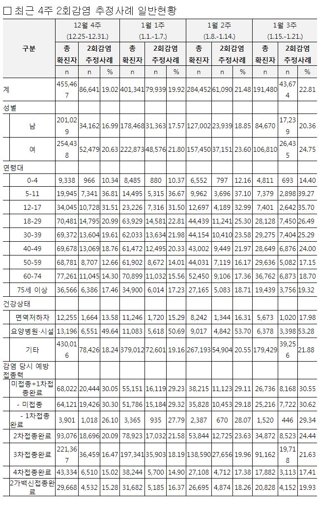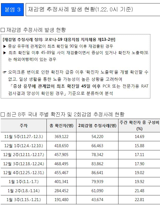○ 주간(1.15.~1.21.) 확진자 중 재감염 추정사례 비율 22.81%로 전주(21.48%) 대비 증가