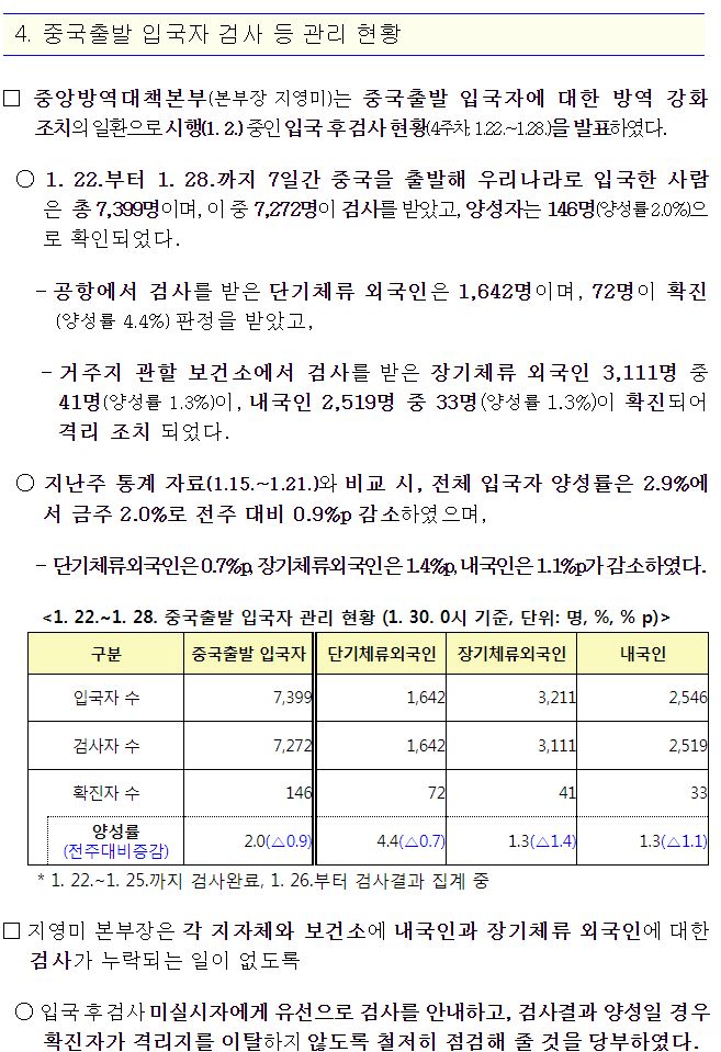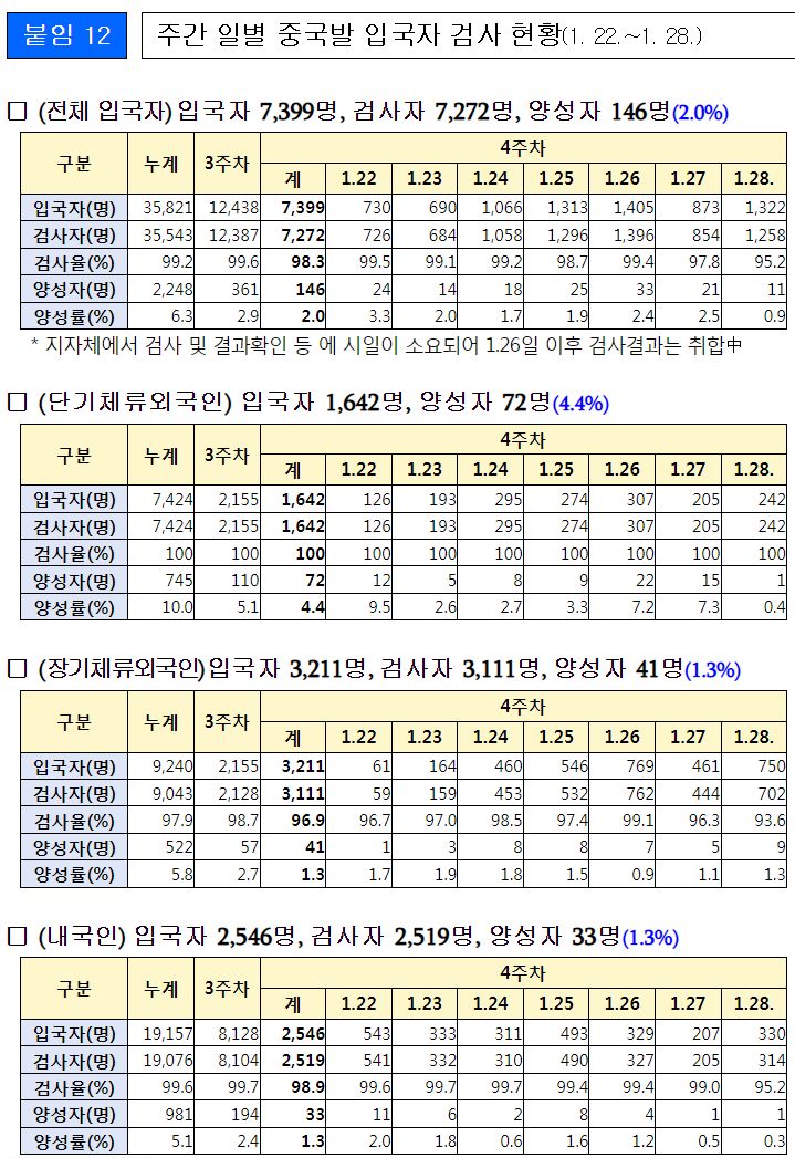 □ 중국출발 입국자 검사 등 관리 현황(1.22~28.)