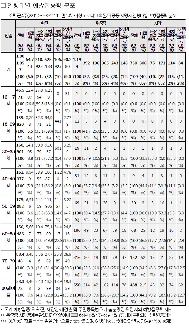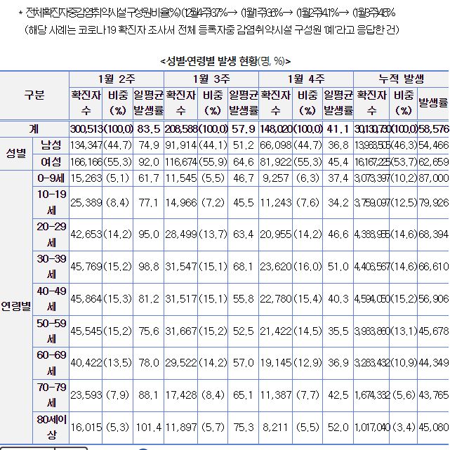 " 1월 3주 일평균 재원중 위중증 환자 중 60세 이상은 409명(88.3%), 일평균 사망자 중 60세 이상은 24명(96.0%)이었다.
