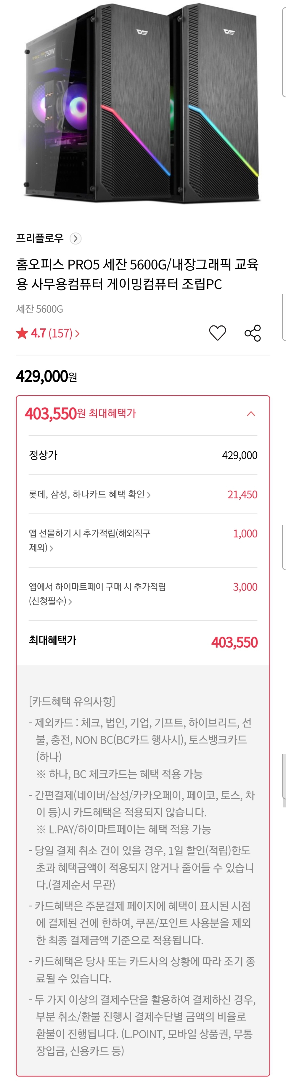 "이왕이면" 견적 에스컬레이션 조심. 이쪽에서 조금만 덜어 CPU에 집중하면 급이 달라진다는 둥.. 그리고 윈도우 불포함 견적이다.