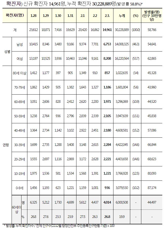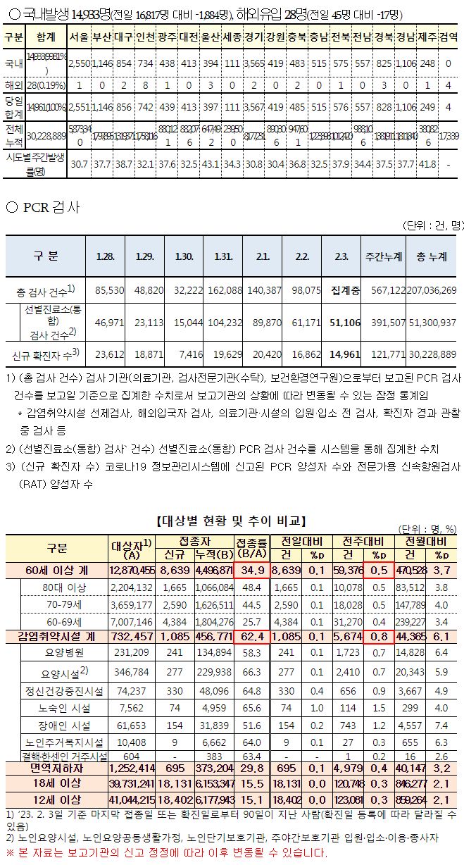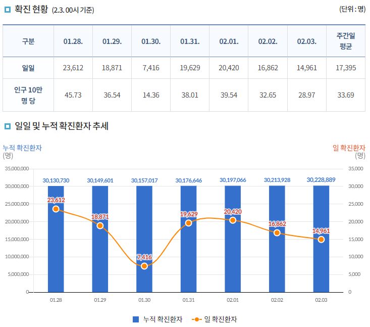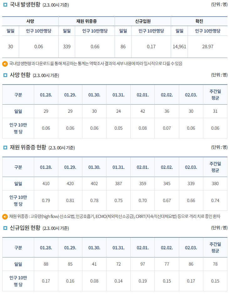 코로나19집계(2023.2.3. 0시기준): 확진 +1.5만, 사망 +30명, 중환자병상가동률 20% 본문
