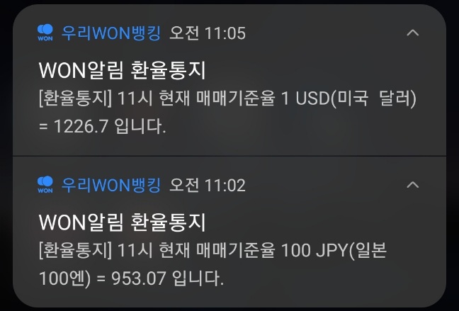 은행앱에 환율알림설정하면, 이렇게 매일 오전 점심 전에 알림을 한 번 띄워줍니다.1