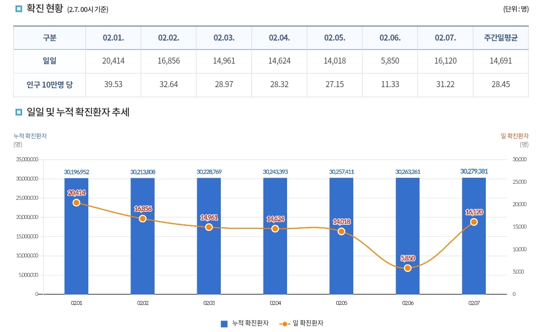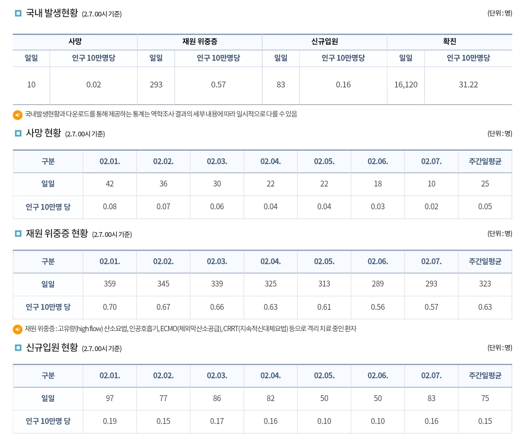 코로나19집계(2023.2.7. 0시기준) 확진 +1.6만, 사망 +10명, 중환자병상가동률 27% 본문