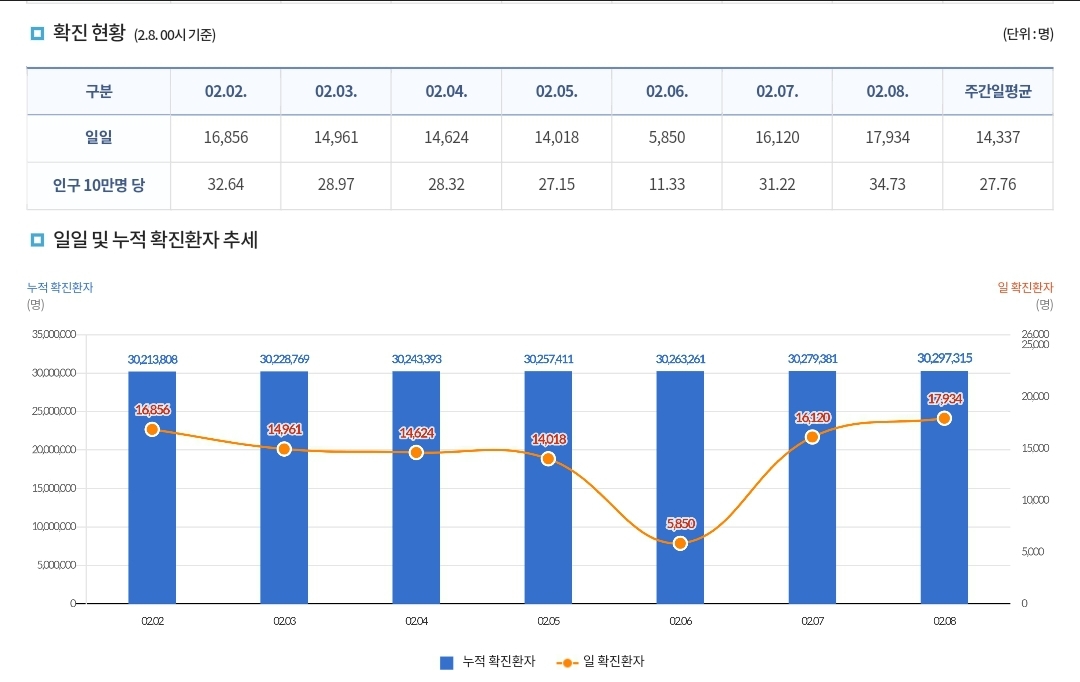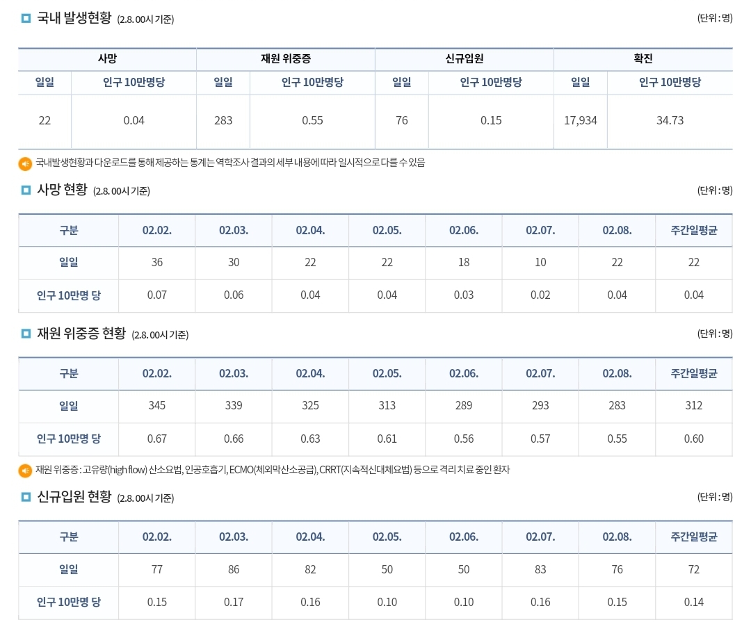 코로나19집계(2023.2.8. 0시기준) 확진 +1.8만, 사망 +22명, 중환자병상가동률 25% 본문