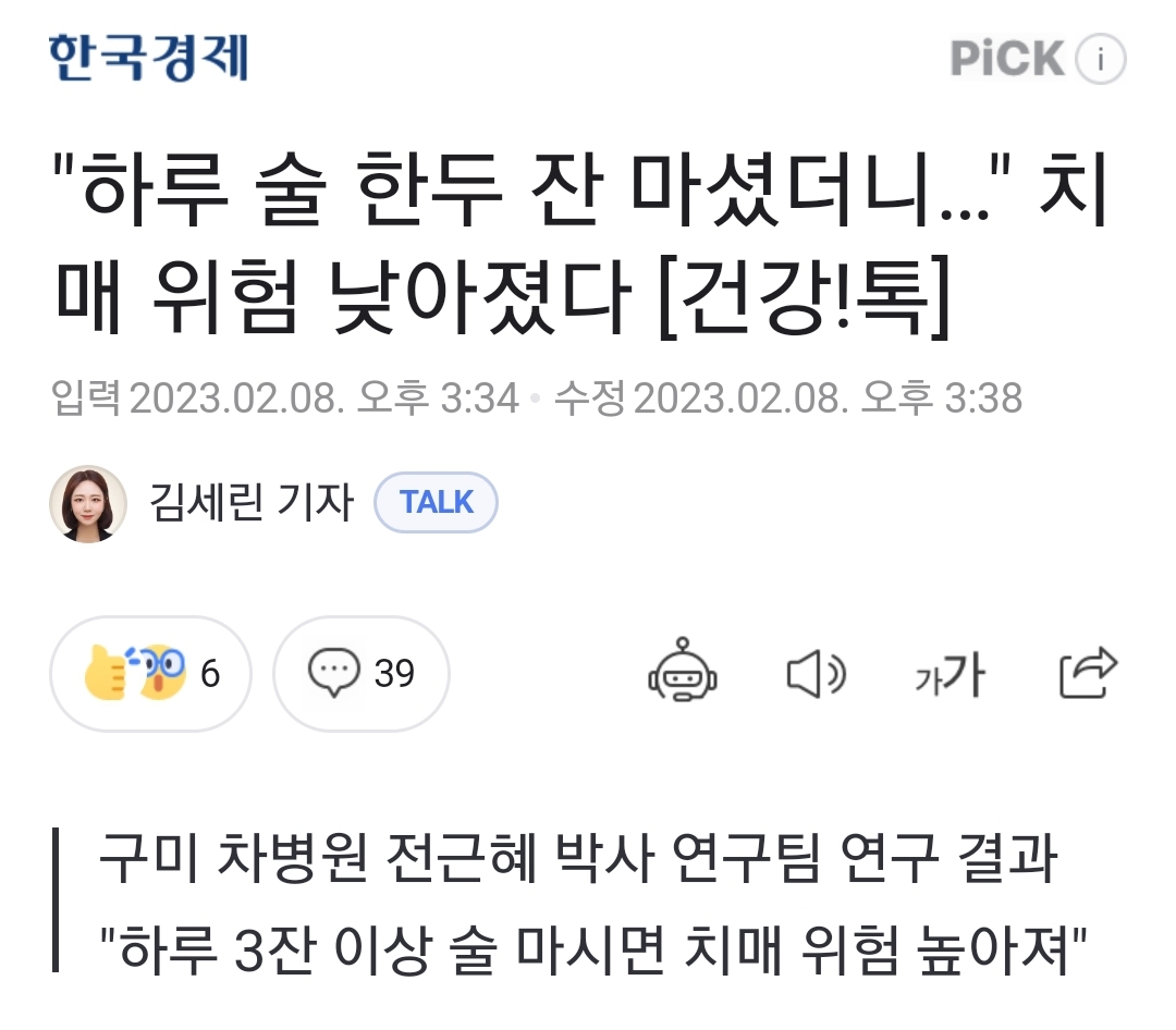 기사 본문은 "1잔보다 많이 마시면 몸상한다"입니다. 그 1잔의 기준은 알콜 15g 미만.