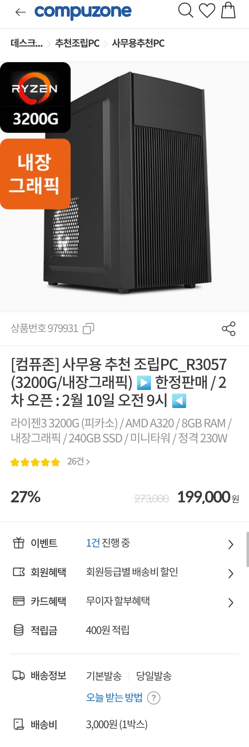 (컴퓨존) 라이젠 3200G + 램 8GB + 240GB SSD (19.9만원 + 배송비 3천원) 본문