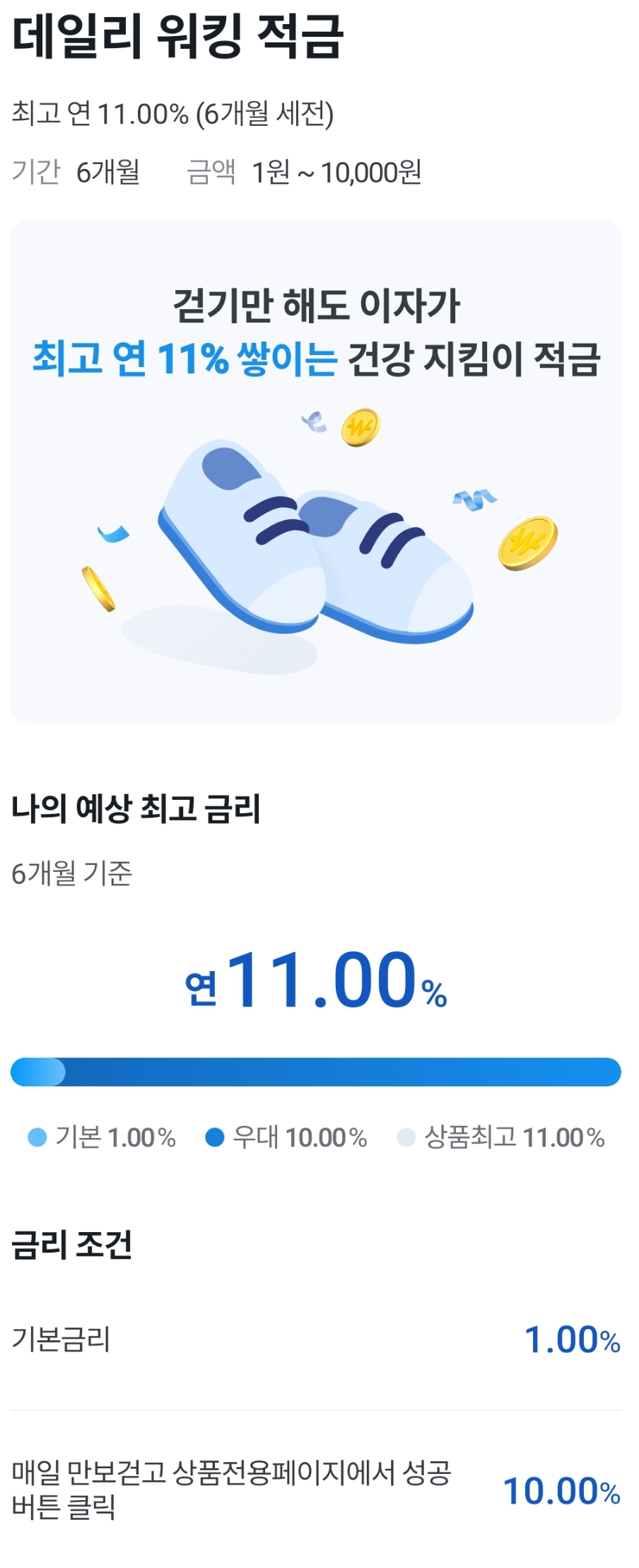 매일 자동이체하는 1만 원은 그날 만 보를 걷고 앱에 출석체크해 인증하면 11%금리적용, 1만 보를 못 걸었으면 1%금리적용입니다.