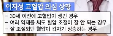 ㅡ 이차성 고혈압은 다른 원인질환이 있거나, 어떤 약물복용의 부작용.