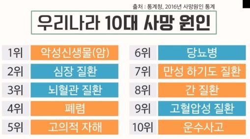 위에서 파랑색이 고혈압의 결과. 하루에 병으로 죽는 사람 4명 중 1명이 고혈압으로 죽는다. (하루 760명 중 200명. 교통사고는 15명 죽는다)