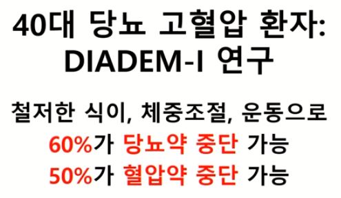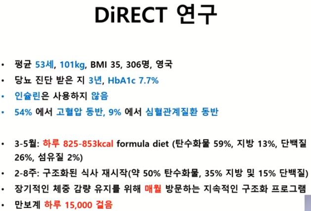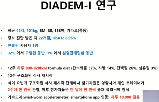 하루 1천칼로리미만. 영양소는 구조화. 1만 보 이상 걷기 등. 그랬더니 꽤 좋았다는 것. 혈압도 정상으로 돌아가기도 하고 당뇨가 치료된 사람도 나오고..
