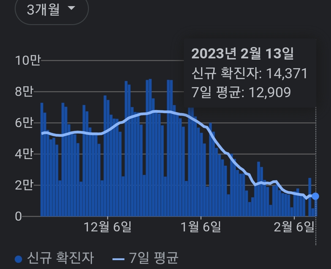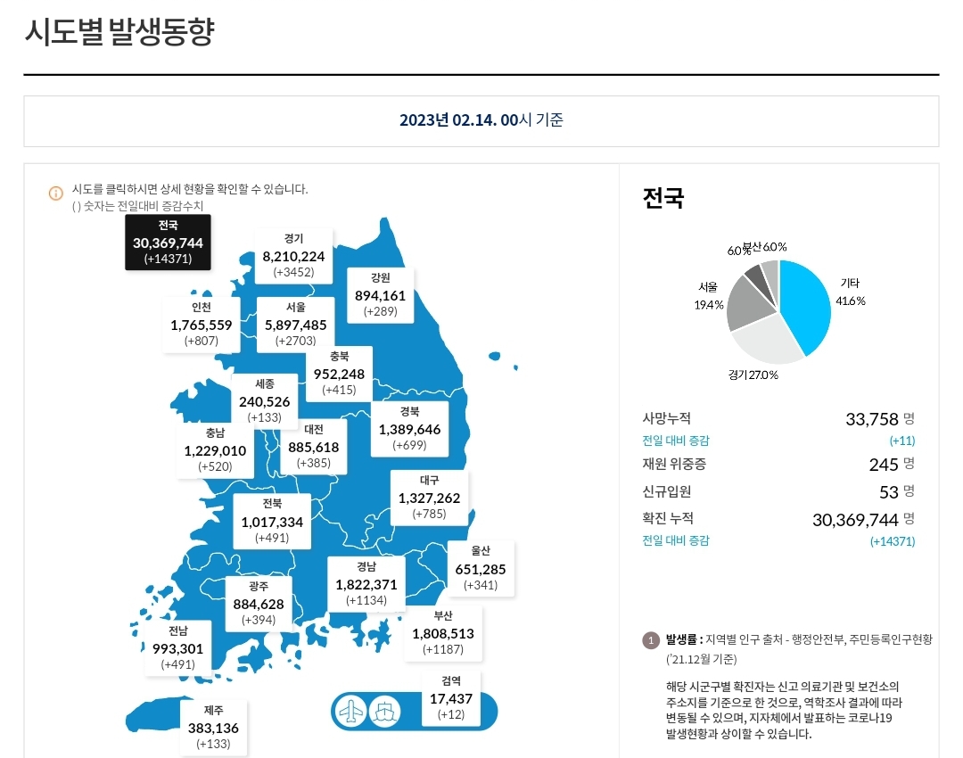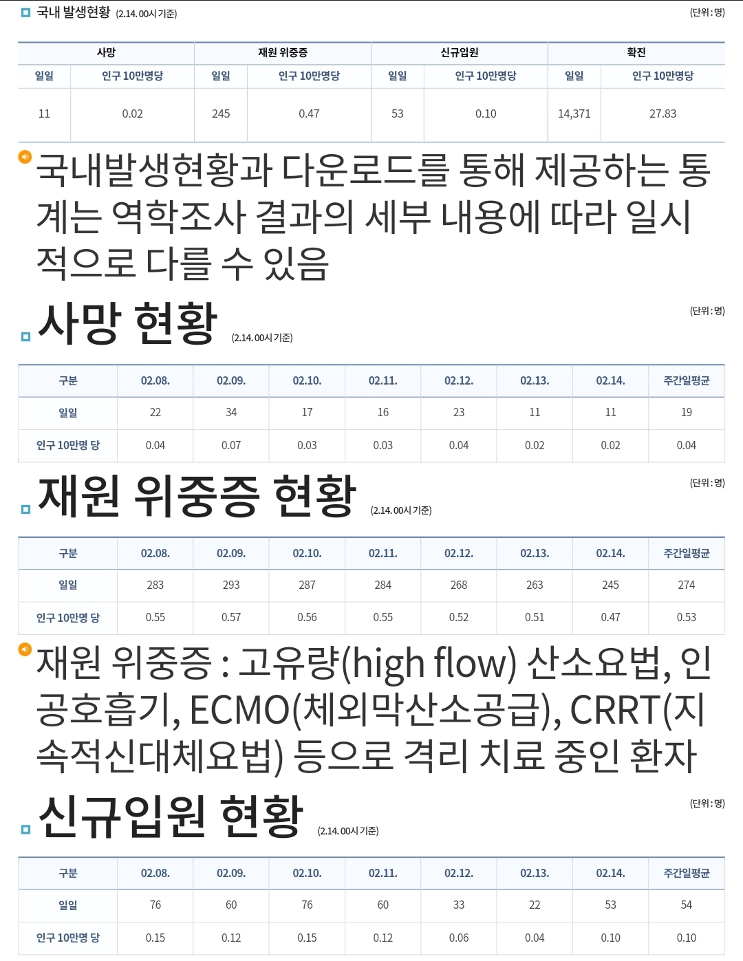 코로나19집계(2023.2.14. 0시기준) 확진 +1.4만, 사망 +11명, 중환자병상가동률 19% 본문