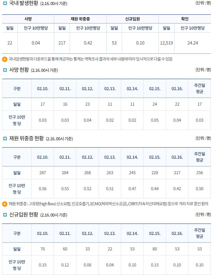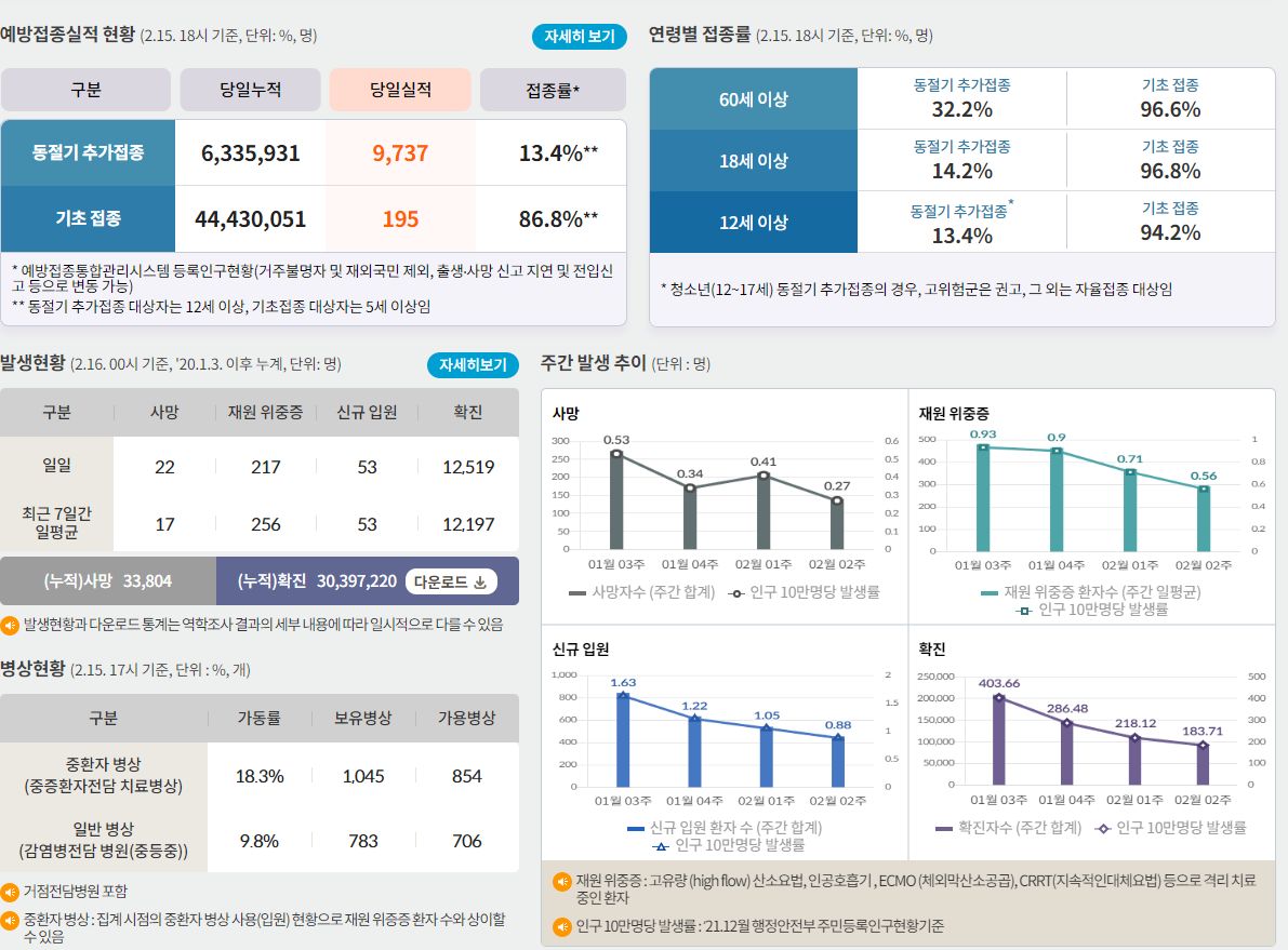 코로나19집계(2023.2.16. 0시기준) 확진 +1.3만, 사망 +22명, 중환자병상가동률 18% 본문