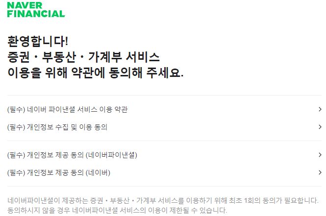 네이버에 로그인한 사람이 finance.naver.com 이나, 네이버 증권, 네이버 환율 사이트 등에 접속하면 아래와 같은 약관동의요구를 받게 됩니다.
