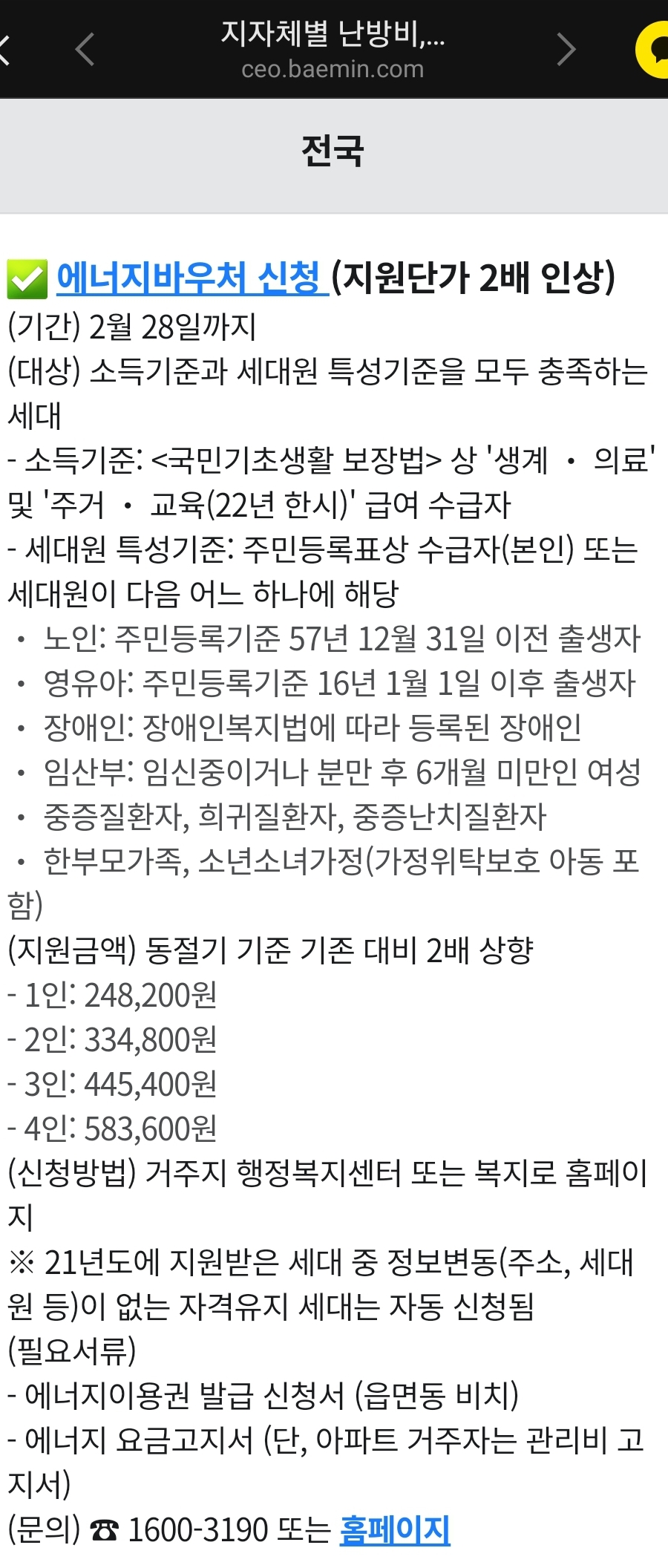 중앙정부와 지방자치단체별 난방비, 에너지 지원 정책 정리(배달의민족 카톡) 본문