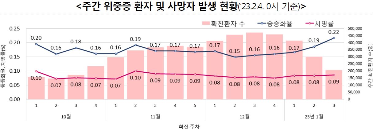 1월 3주차 확진자를 2주간 모니터링한 결과, 중증화율 0.22%, 치명률은 0.09%